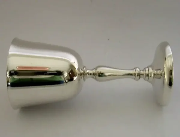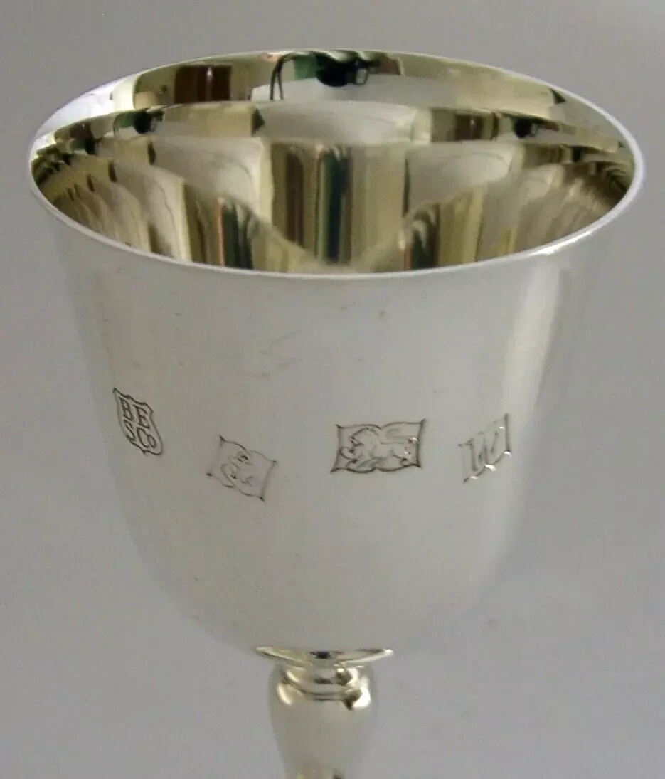 A very nicely made English solid sterling silver goblet. It is hallmarked for Birmingham 1971 with the makers mark being BESco. It has been superbly designed having feature hallmarks and is in superb condition being free from dings splits distortions and repairs. It measures almost 5.5 inches (13.6cm) tall by over 2.5 inches (6.6cm) across the rim and weighs 136 grams. A very good quality piece.