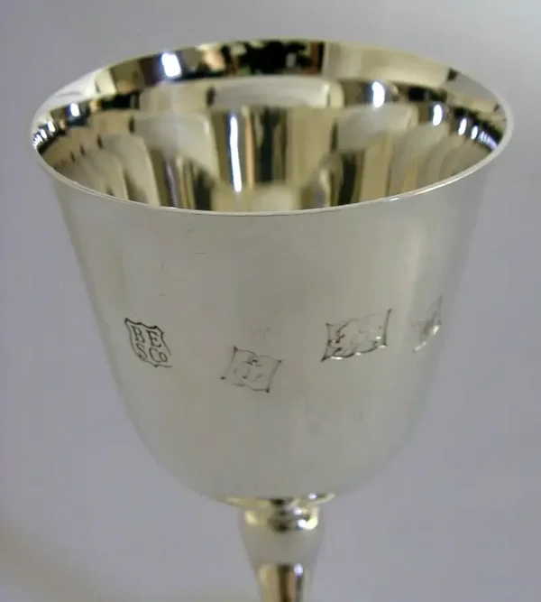 A very nicely made English solid sterling silver goblet. It is hallmarked for Birmingham 1971 with the makers mark being BESco. It has been superbly designed having feature hallmarks and is in superb condition being free from dings splits distortions and repairs. It measures almost 5.5 inches (13.6cm) tall by over 2.5 inches (6.6cm) across the rim and weighs 128 grams. A very good quality piece.