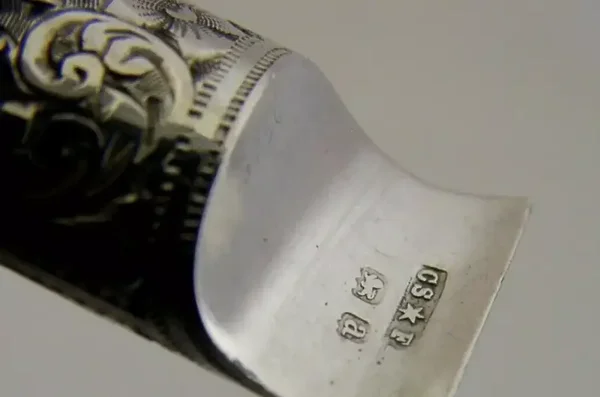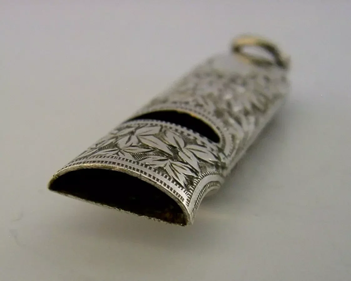 A super quality English Victorian sterling silver sporting or dog whistle. It is hallmarked for Birmingham 1900 with the makers mark being that of Saunders and Shepherd. It has been superbly designed being engraved with flowers and leaves and is in super condition being free from dings splits holes distortions and repairs. It whistles loudly. It measures approx. 2.25 inches (5.6cm) long including the loop and weighs 7 grams. A very nicely designed piece.