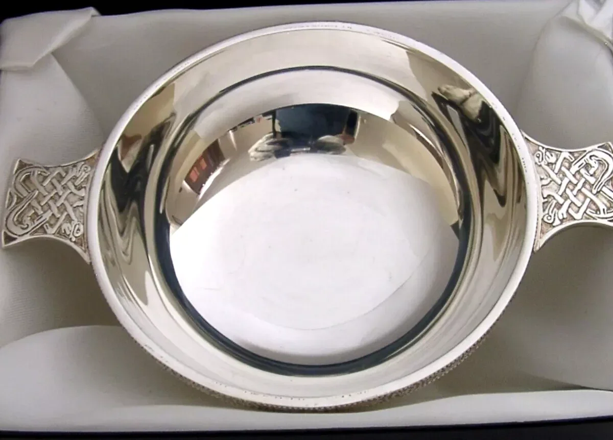BEAUTIFUL MINT CELTIC SILVER PLATE WHISKY QUAICH CUP BOWL c1990 BOXED