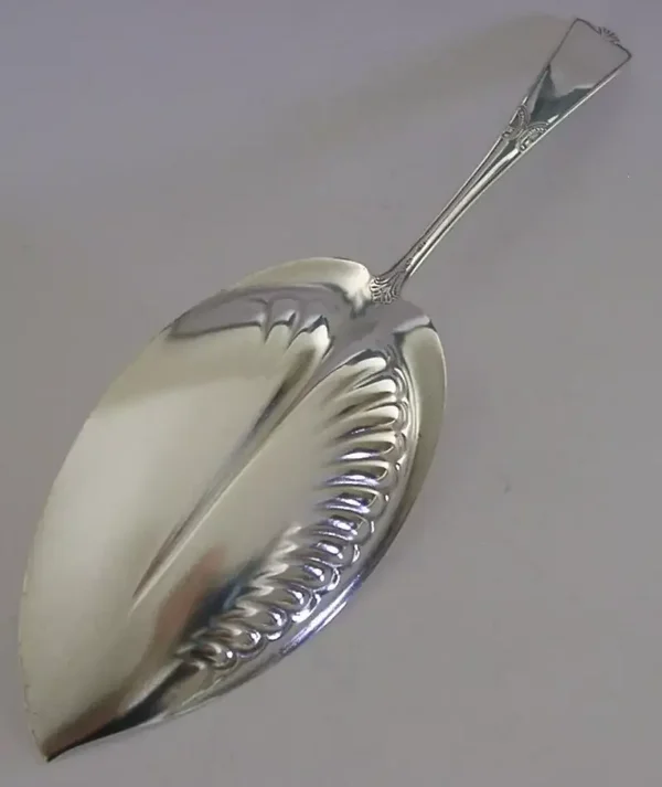 A beautiful American antique solid sterling silver server. It is hallmarked STERLING along with a makers mark and dates to c1890. It has been superbly designed with the terminal being engraved with a crest used by the Lukin famiy . It is in super condition being free from dings splits distortions and repairs. It measures approx. 10.5 inches (26.5cm) long by 2.75 inches (7cm) wide and weighs 106 grams. A beautifully made example.