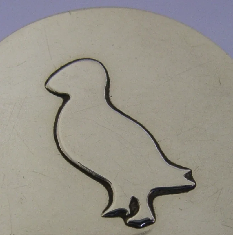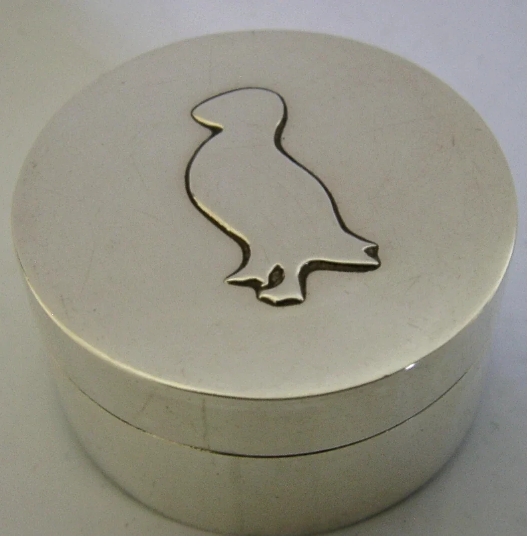 A superb Scottish solid sterling silver trinket box. It is hallmarked for Edinburgh 1989 with the maker being Orkneyinga Silversmiths (Liz and Kevin Allen, Birsay, Orkney, Scotland). It has been superbly designed with the lid being decorated with a silhouette of a puffin. It is in superb condition being free from dings splits and repairs. It measures over 1.5 inches (4cm) across by over 0.75 inch (2cm) tall and weighs 28 grams. A very nicely made piece.