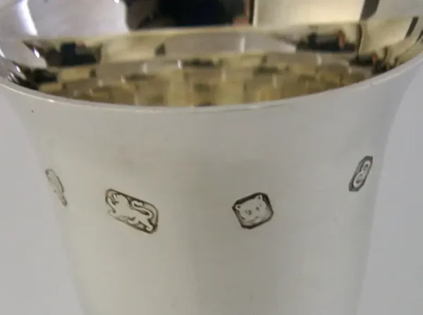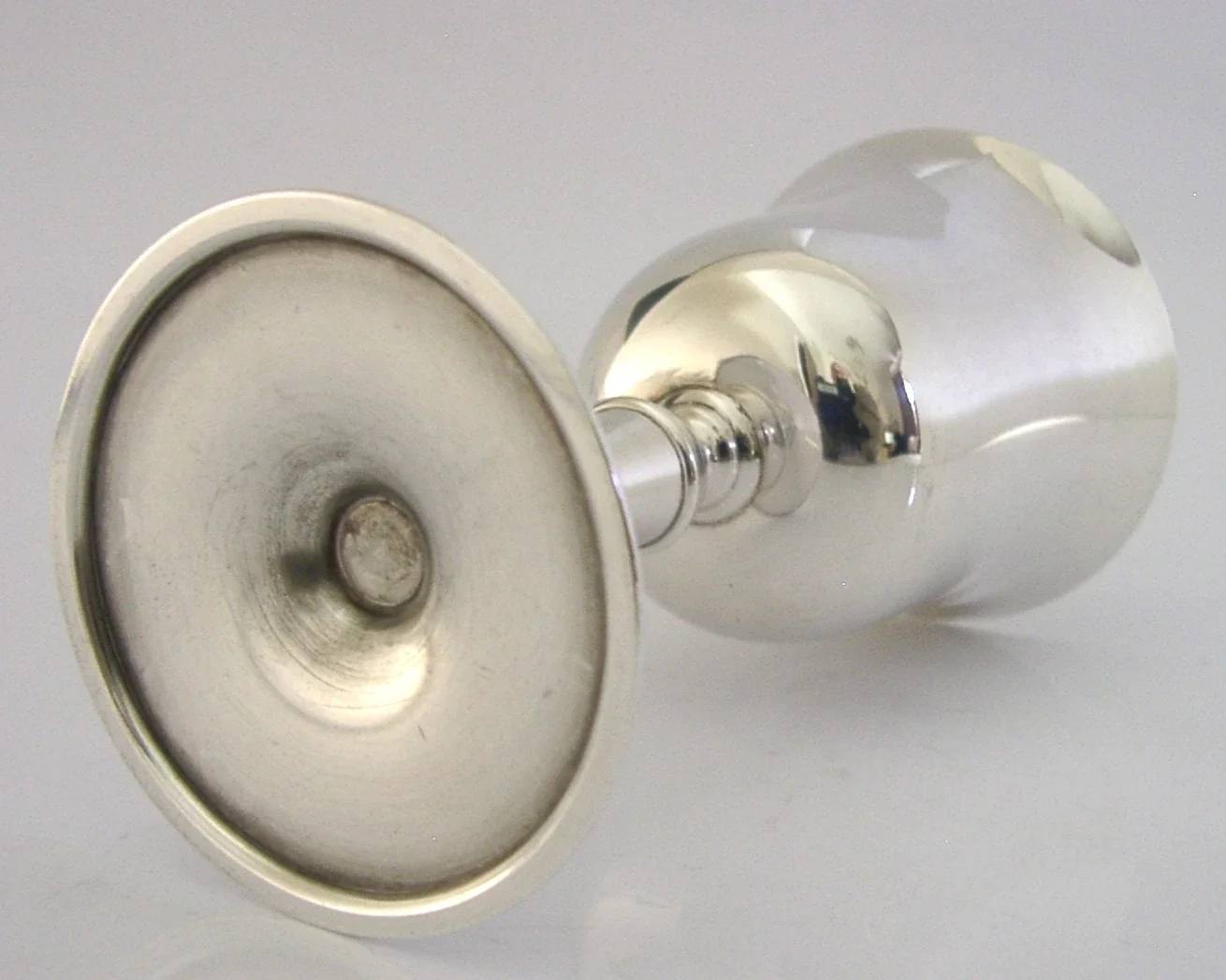A super quality English solid sterling silver goblet. It is hallmarked for London 1979 with the makers mark being that of C J Vander. It has been superbly designed and holds 50ml. It is in super condition being free from dings splits distortions and repairs. It measures approx. 4.25 inches (10.6cm) tall by over 2 inches (5.6cm) across the rim and weighs 106 grams. A very good quality piece.