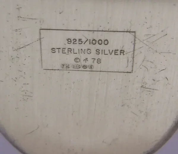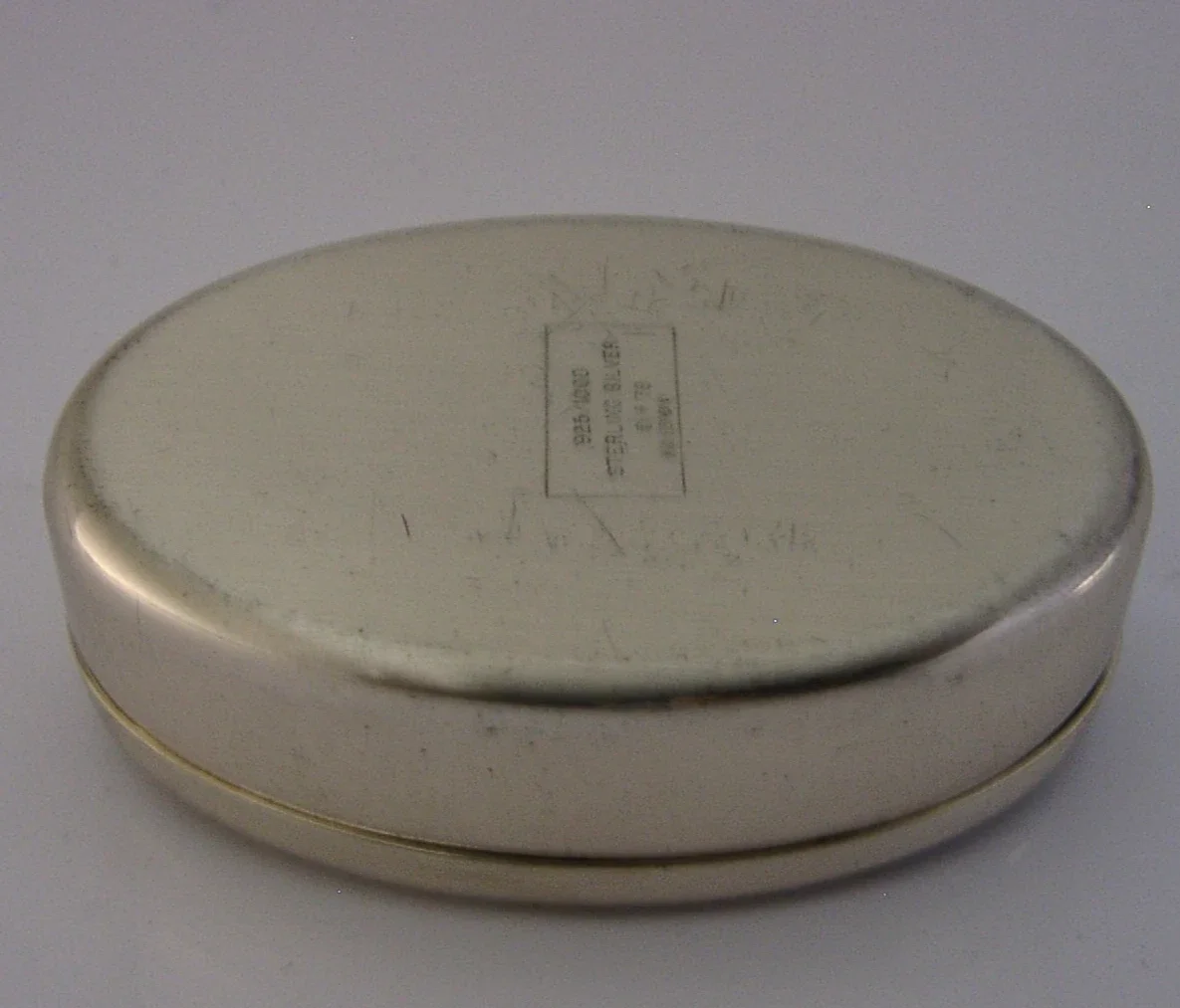 A nice quality solid sterling silver box. It is hallmarked with London import marks for 1979 along with importers mark being that of Franklin Mint. It is in superb condition being free from dings, splits and repairs. It measures approx. 2.25 inches (5.6cm) across by 1.5 inches (3.6cm) wide by 0.75 inches (1.8cm) tall and weighs 24 grams. A very good quality well made piece.
