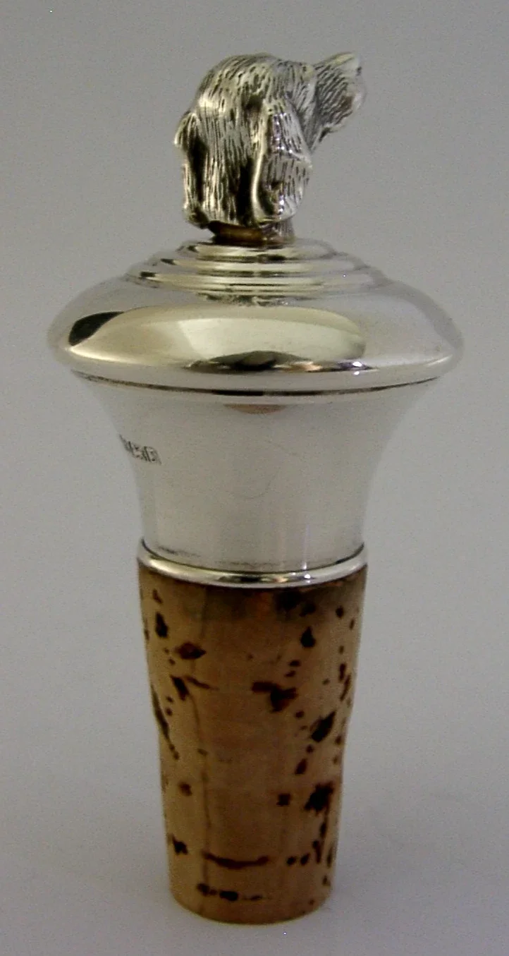 A very nice quality solid sterling silver bottle stopper. It is hallmarked for Birmingham 1992 with the maker being DP. It has been superbly designed being cast in the form of a retriever dogs head. It is in super condition being free from dings splits holes and repairs. It measures approx. 3.5 inches (8.8cm) tall including the cork by over 1.5 inches (3.8cm) wide and weighs 56 grams. A nice quality well made piece.