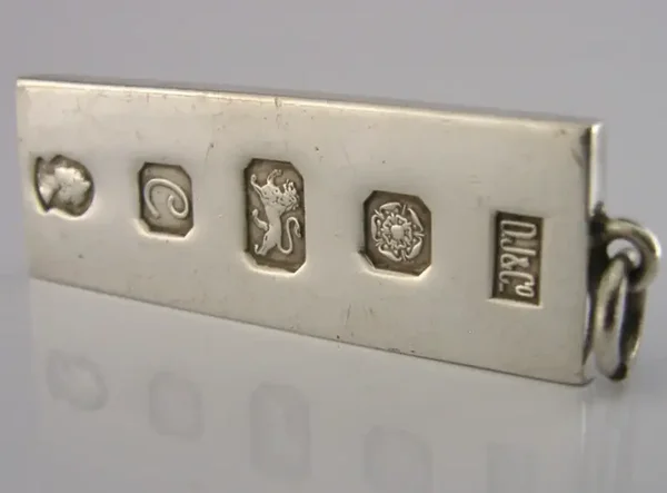 A English solid sterling silver ingot pendant. It is hallmarked for Sheffield 1977 with the maker being DJ&Co. It has been well made having feature hallmarks and is in super condition being free from dings splits and repairs. It measures over 1.75 inches (4.8cm) long excluding the loop by almost 0.75 inch (1.6cm) wide and weighs 22 grams. An unusual piece.