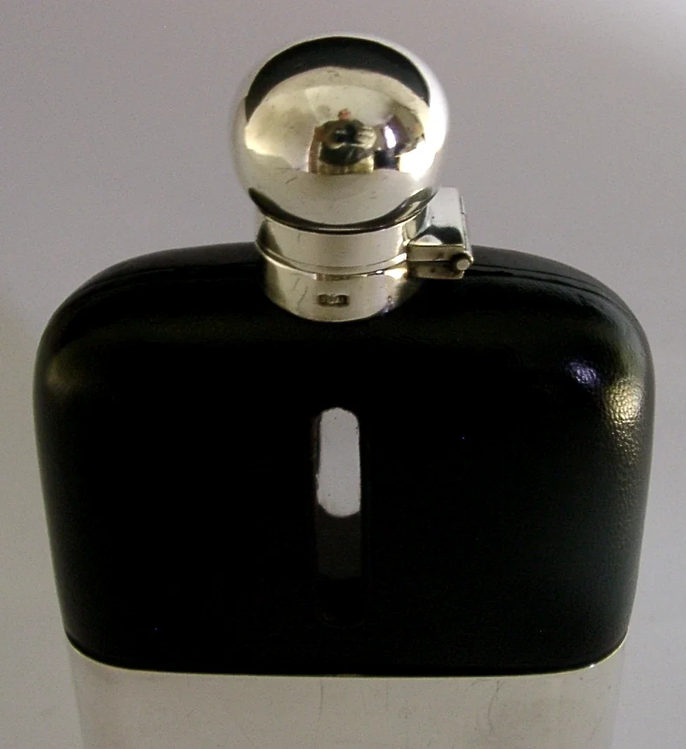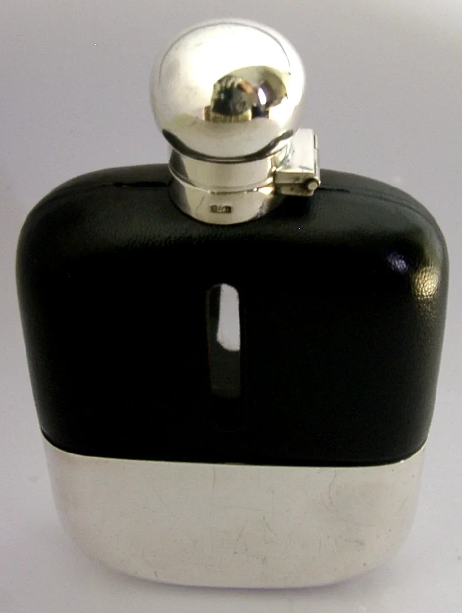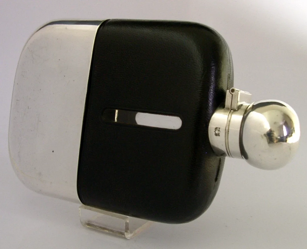 A super quality large English antique silver plated, leather and glass hip flask. It is marked on the collar with the makers mark of James Dixon & Sons Ltd along with the bugle mark used from 1879. I would date this piece to c1910-1920. It has been retailed by FINNIGANS Ltd LONDON MANCHESTER & LIVERPOOL. It has been superbly designed and is in superb condition being free from splits holes chips cracks and repairs, it has of course been used. No wear to the plate. It measures approx. 6.75 inches (17.2cm) tall by over 4 inches (10.5cm) wide and weighs 488 grams. A superbly made piece.