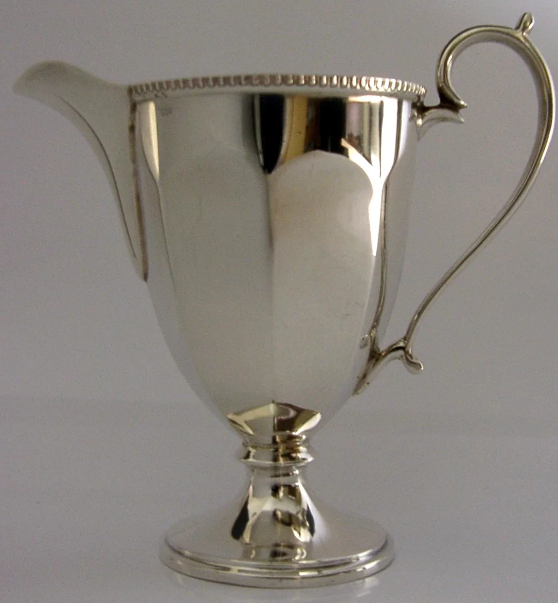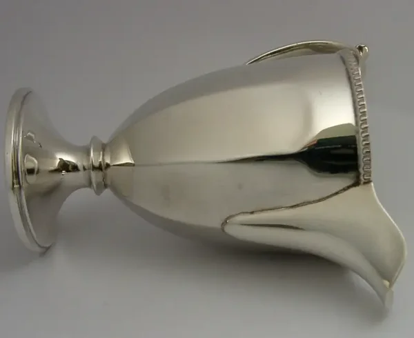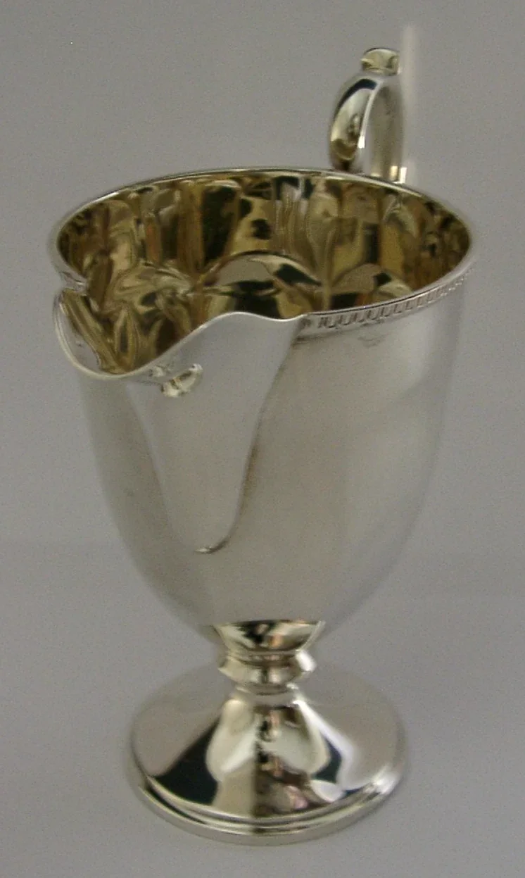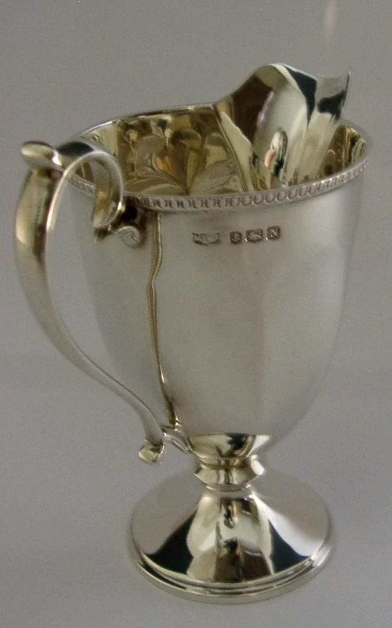 A beautiful high quality English solid sterling silver cream jug. It is hallmarked for Birmingham 1937 with the makers marks being Mappin and Webb. It has been superbly made having a very nice shape and is in superb condition being free from dings splits holes and repairs, the inside is clean. It measures over 4 inches tall (10.3cms) to the top of the handle by a fraction less wide handle to spout and weighs 78 grams. A well made beautiful piece.