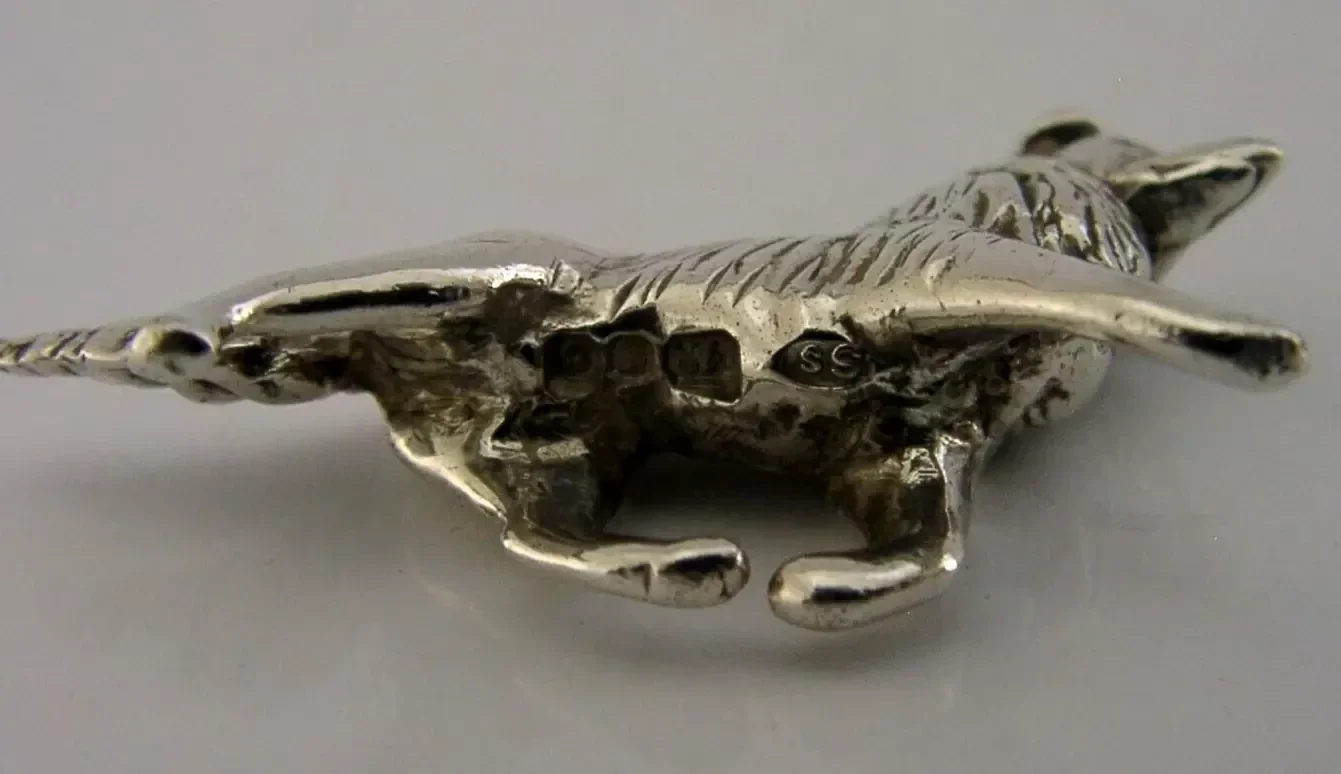 A superbly cast solid silver miniature animal figure. It is marked with for London 1978 with the maskers marks being SS. It has been beautifully designed being solid cast in the form of a Collie Sheep Dog. It is in perfect condition being free from dings splits and repairs, tiny casting cracks to the front leg but its stable. It measures approx. 1.75 inches (4.4cms) long by 1 inch tall and weighs 17 grams. A more unusual piece.