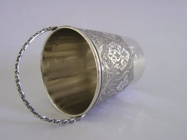 A nicely detailed Persian solid silver beaker cup. It is marked with the 84 silver standard. I would date it to c1940. hey have been superbly designed and is in super condition being free from dings splits holes and repairs. It measures approx. 2 inches (5.2cm) tall to the rim by 2 inches (5.1cm) across the rim and over 1.25 inches (3.4cm) across the base and weighs 56 grams. A very nicely designed piece.