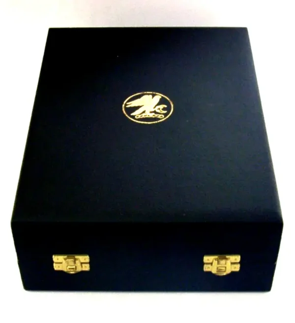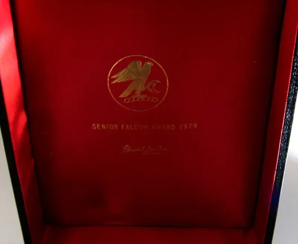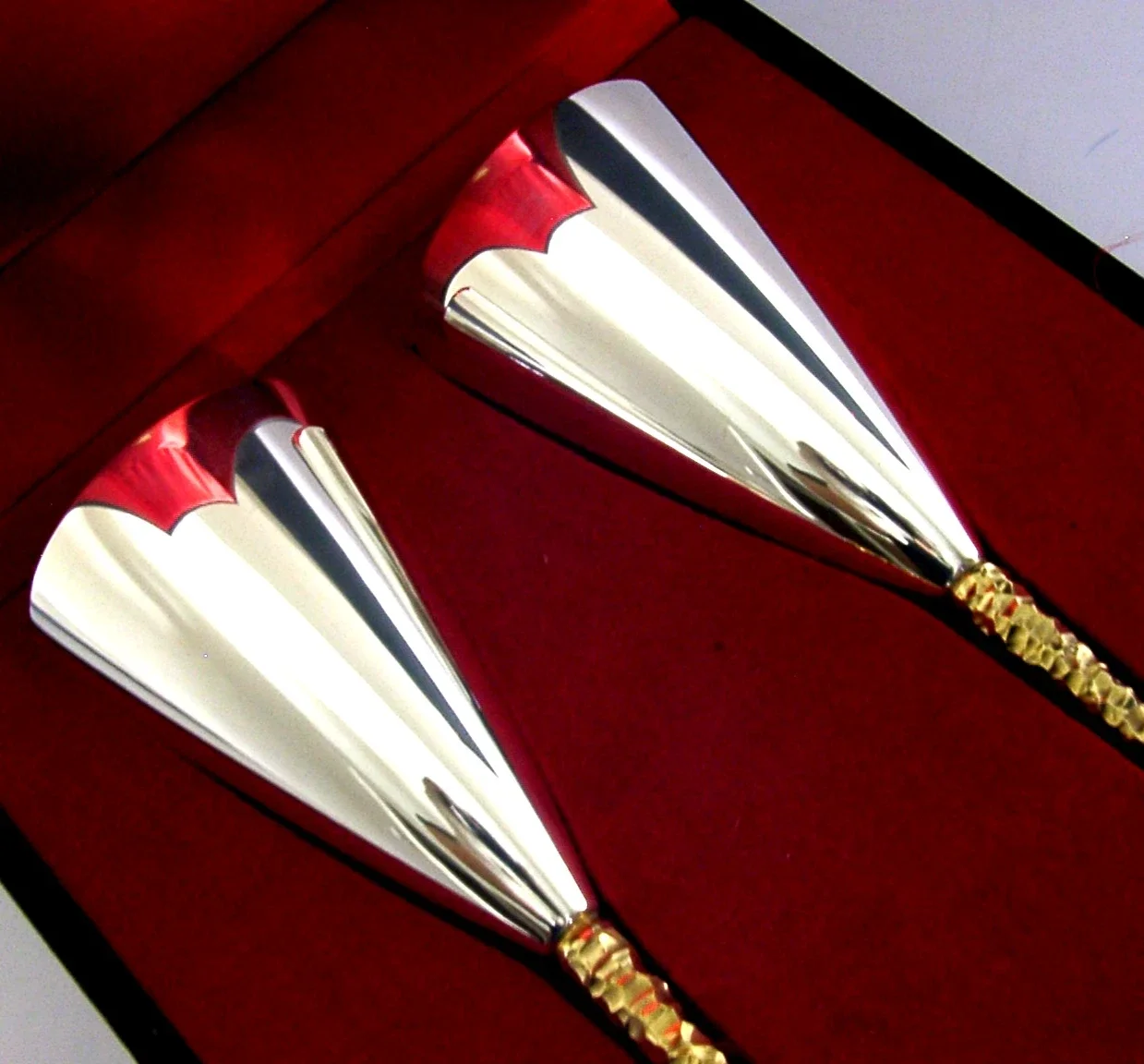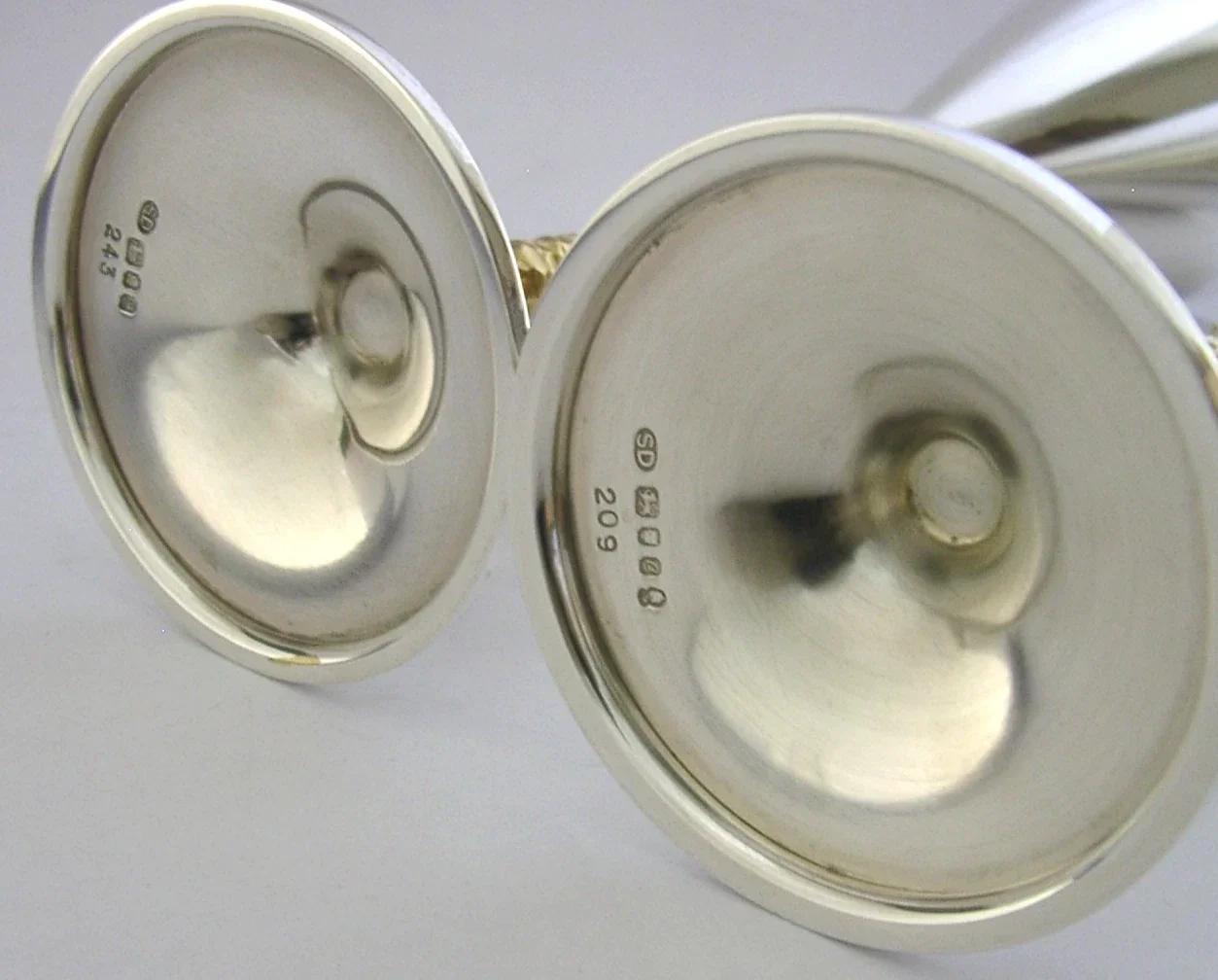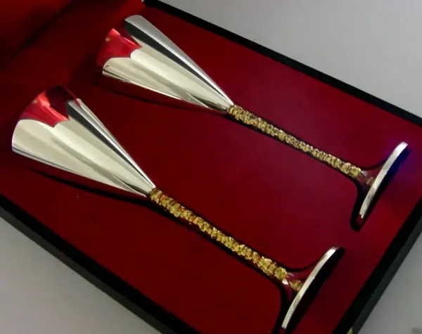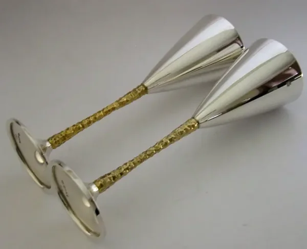 A beautiful very high quality pair of English solid sterling silver wine or champagne goblets. They are hallmarked for London 1979 with the makers being SD for Stuart Devlin. The also have a small falcon mark, the box is marked Senior Falcon Award and limited edition numbers to their bases 209 and 243. They have been superbly designed and are in superb condition being free from dings splits distortions and repairs. The case is also superb. They measures approx. 8.75 inches (22.5cm) tall by a touch under 3 inches across the rims and combined weigh 408 grams (excluding the box). A top quality well made set.