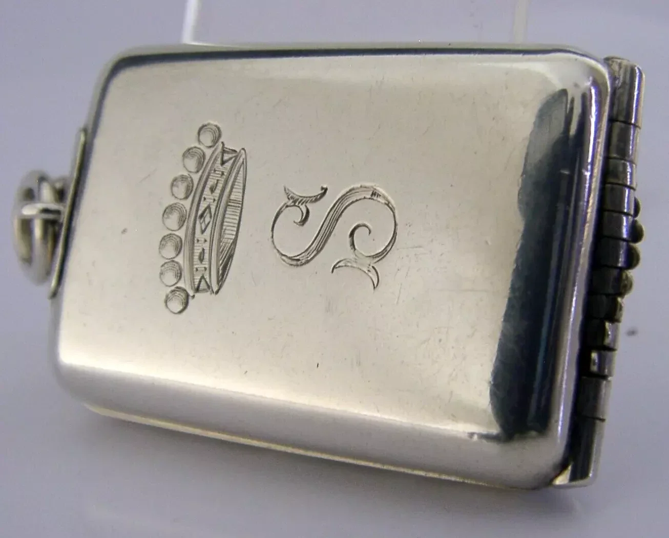 A very rare English Victorian antique solid sterling silver butt marker box. It is hallmarked for London 1898 with the maker being John Millward Banks. It has been superbly designed and has been engraved with a Viscount Coronet crest and the single initial S. It is in super condition being free from dings splits distortions and repairs. The hinge is smooth and tight. It measures approx. 1.75 inches (4.8cm) long excluding the loop by 1.25 inches (3.2cm) wide and weighs 42 grams. A very high quality rare piece.