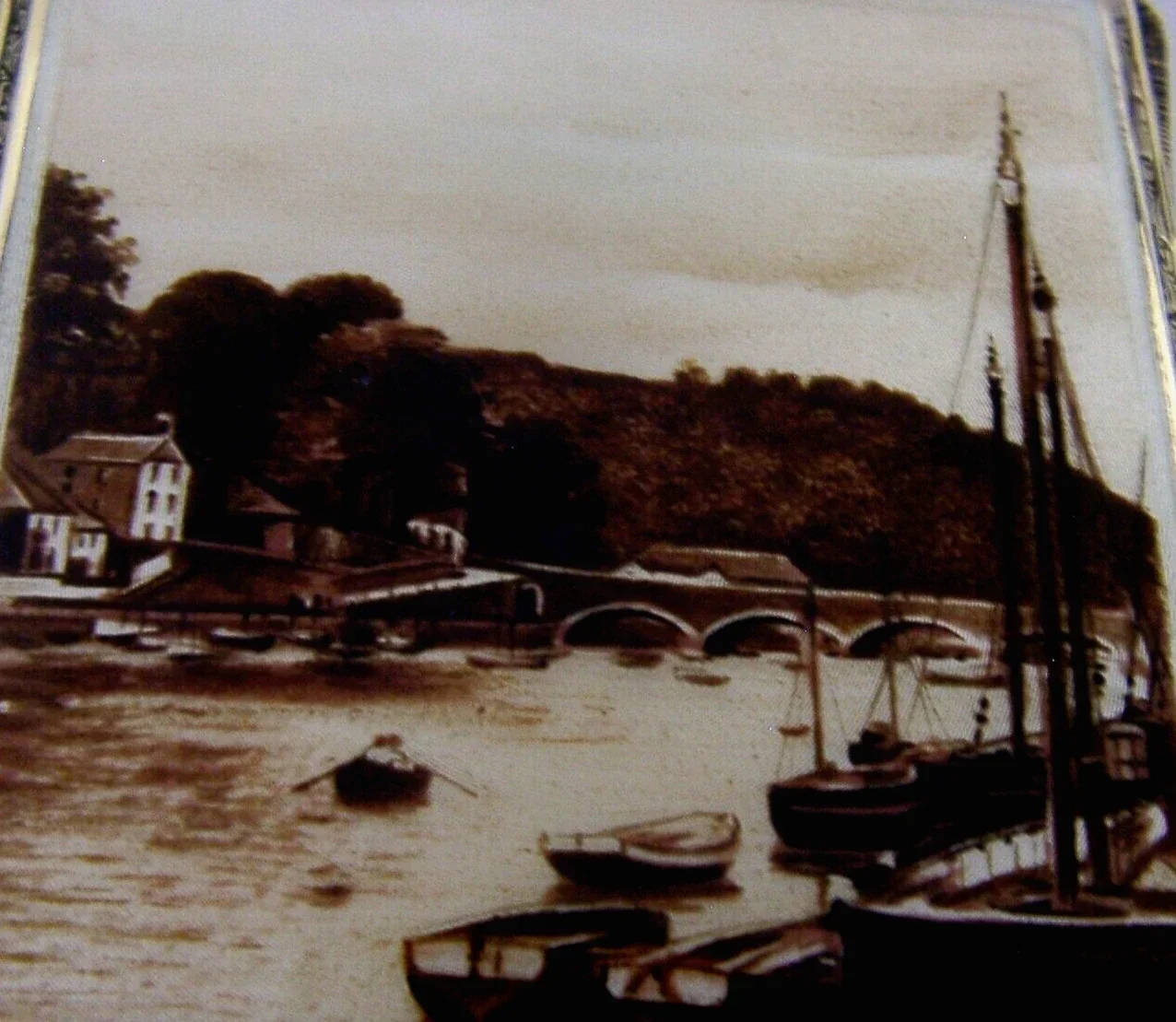 A stunningly beautiful and rare solid sterling silver and enamel cigarette case. It is hallmarked for with import marks for London 1929 with the makers marks being FBR. It has been beautifully made having a hand painted scene of Looe Bridge in Cornwall, the inside bottom left of the case has been engraved 'Looe'. The whole piece has been gilded. It is in superb condition being free from dings splits and repairs. The enamel is complete and free from chips repairs and cracks. It measures approx. 3.5 inches (8.8cms) by almost 3 inches (7.4cms) and weighs 123 grams. A beautifully designed rare piece.