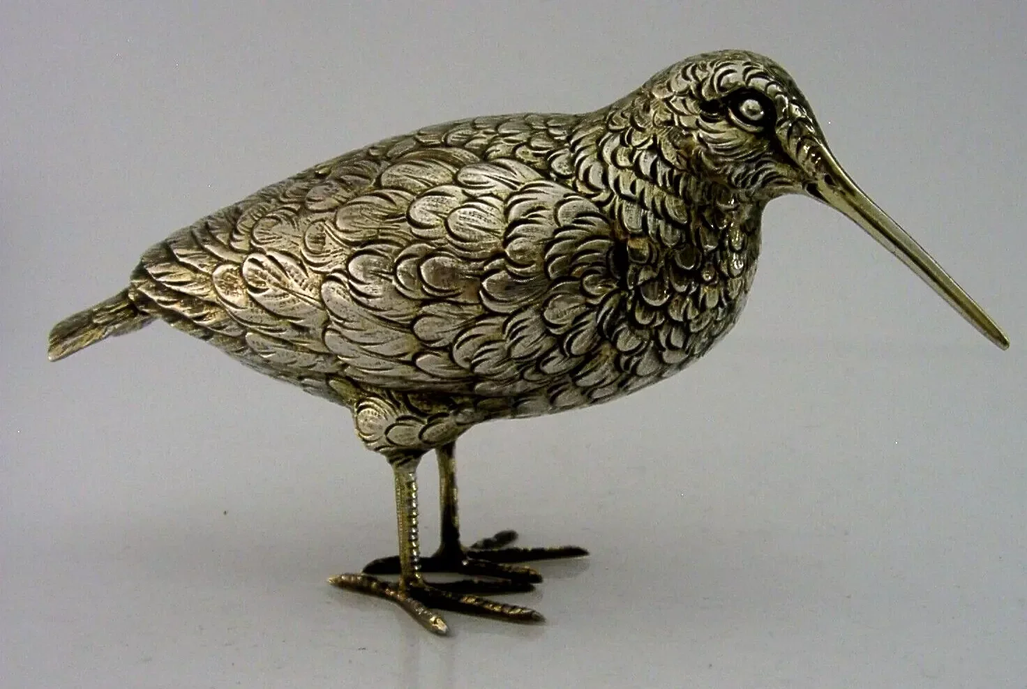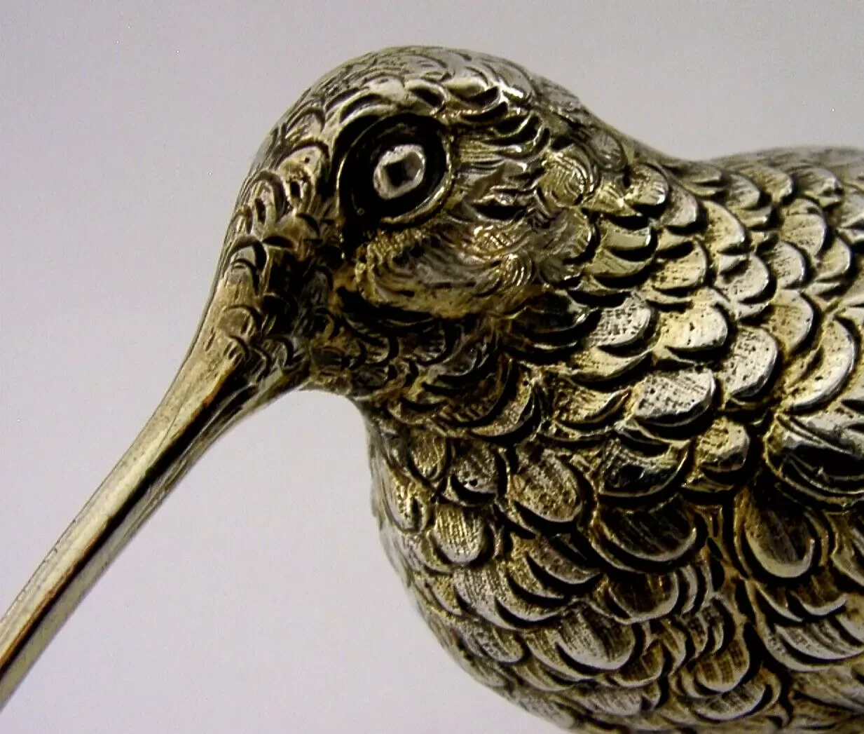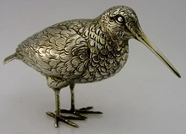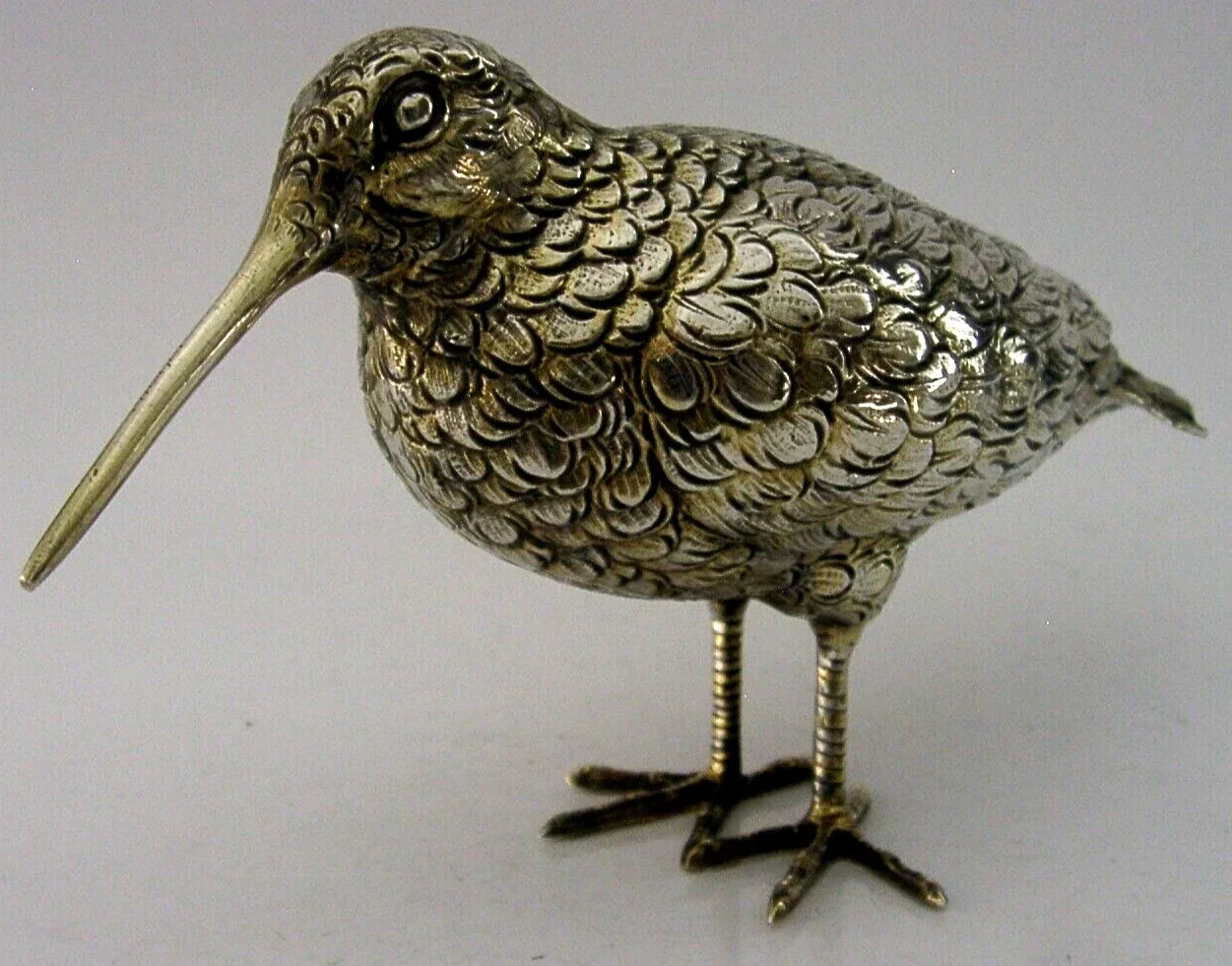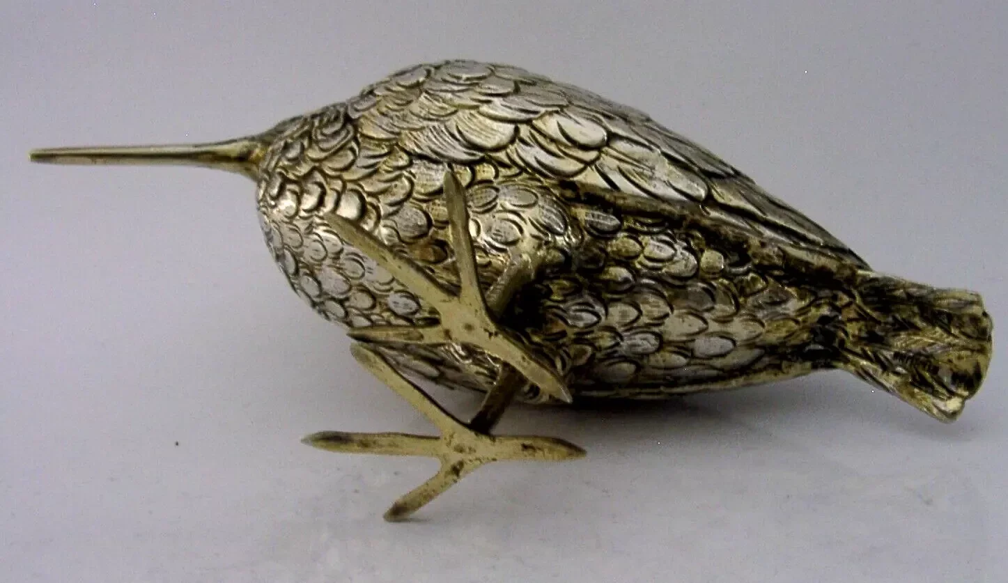 A rare superbly modelled large sterling silver bird figure. It is hallmarked 925 STERLING. I would date it to c1960s almost certainly made in Germany who were also making good quality silver pheasants around this time. It has been beautifully modelled being finely cast in the form of a lightly gilded Woodcock bird. It is in super condition being free from dings splits and repairs. It measures approx. 6 inches (15.2cm) long beak to tail by 2.25 inches (5.6cm) wide by 3.5 inches (9cm) tall and weighs 172 grams (all silver weight, i.e. it is not filled). A very well designed high quality rare example which would make a great shooting prize.