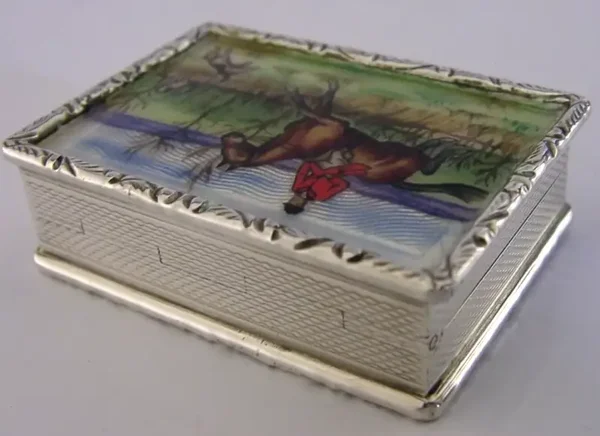 A beautiful rare English solid sterling silver and enamel box. It is hallmarked for Birmingham 1977 with the makers marks being SJR. It has been beautifully made being hand painted with a traditional hunting scene. It is in superb condition being free from dings splits and repairs. No chips cracks or repairs to the enamel. The inside is gilded. It measures approx. 2 inches (4.9cms) across by 1.25 inches (3.3cm) wide by 0.5 inches (1.3cms) tall and weighs 61 grams. A superbly made very high-quality piece.