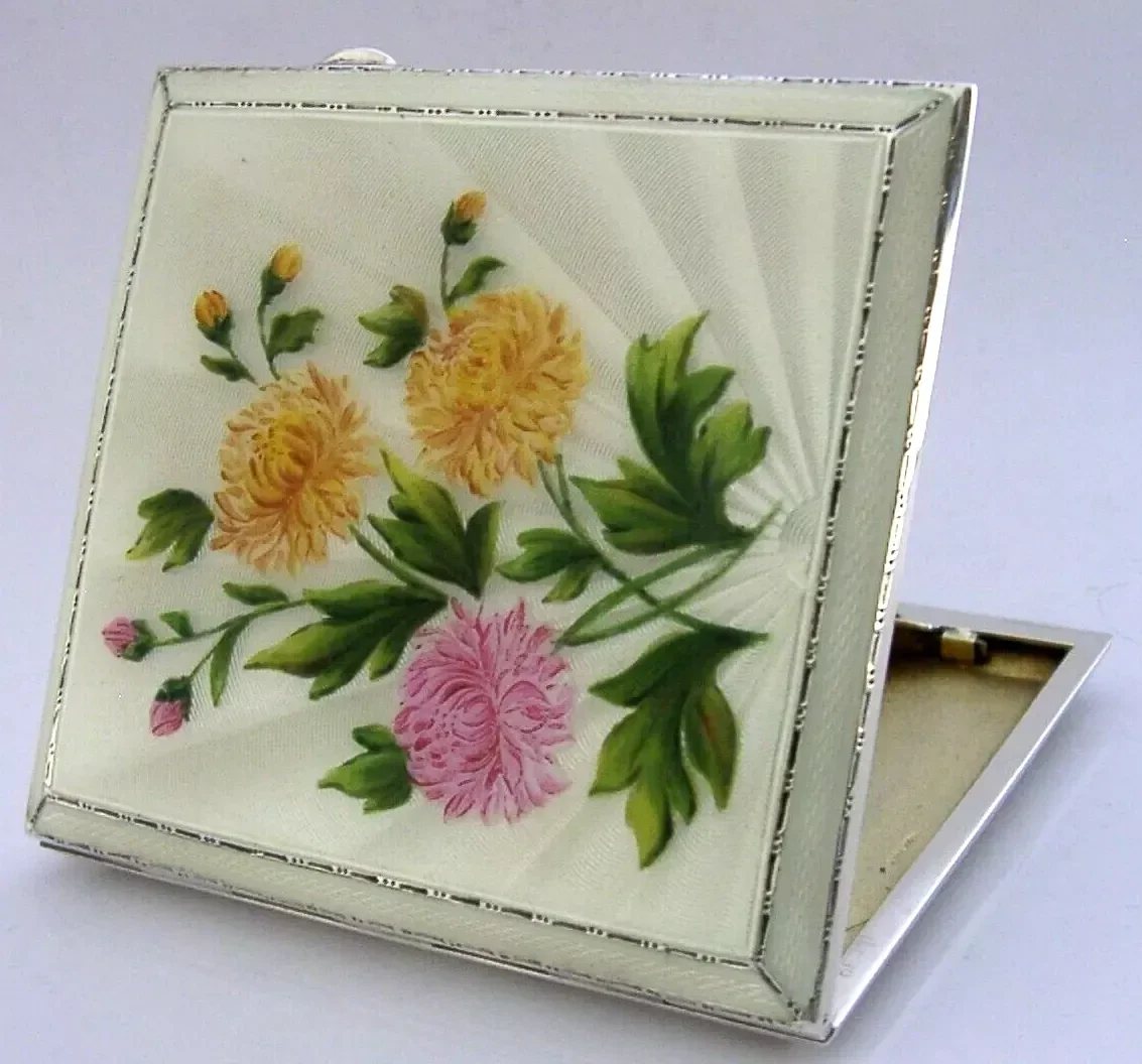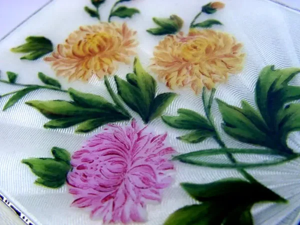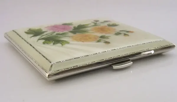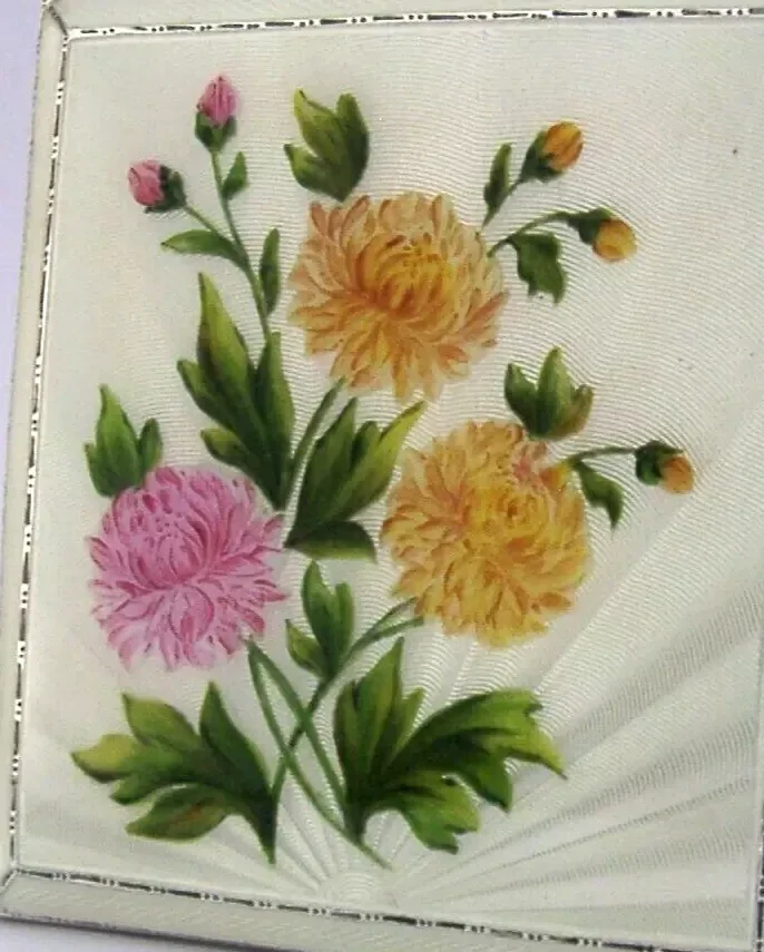 STERLING SILVER ENAMEL HAND PAINTED CHRYSANTHEMUM FLOWER CIGARETTE CASE 1959