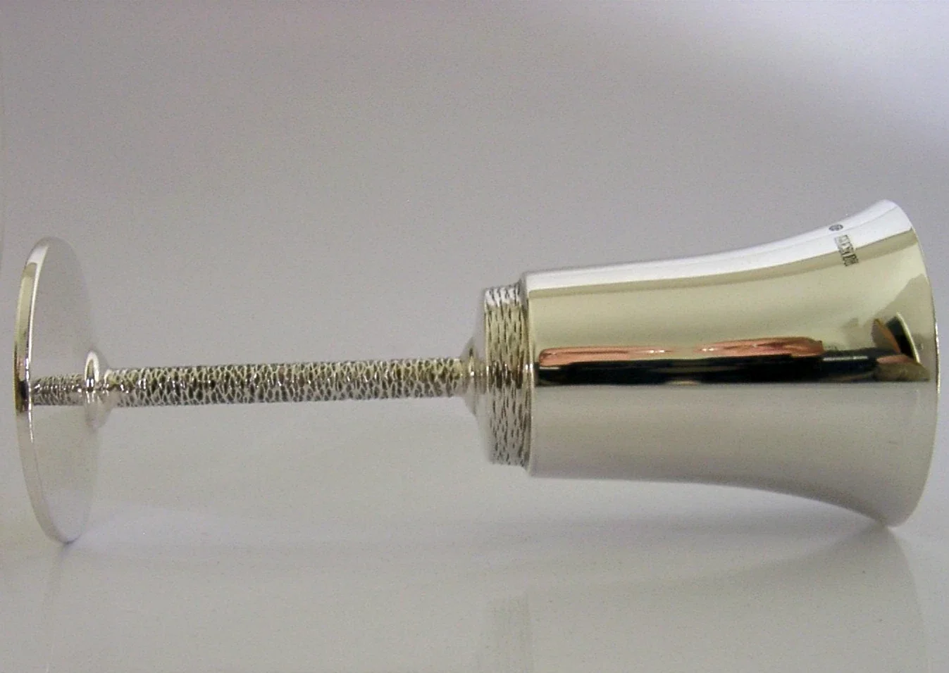 A very nicely designed stylish English solid sterling silver goblet. It is hallmarked for Birmingham 1971 with the maker being I F & Son LTD. It has been superbly designed having a modernist textured stem and flared internally gilded bowl. It is in superb condition being free from dings splits distortions and repairs. It measures 6.25 inches (16cm) tall by 2.5 inches (6.4cm) across the rim and weighs 124 grams. A very good quality well made piece.