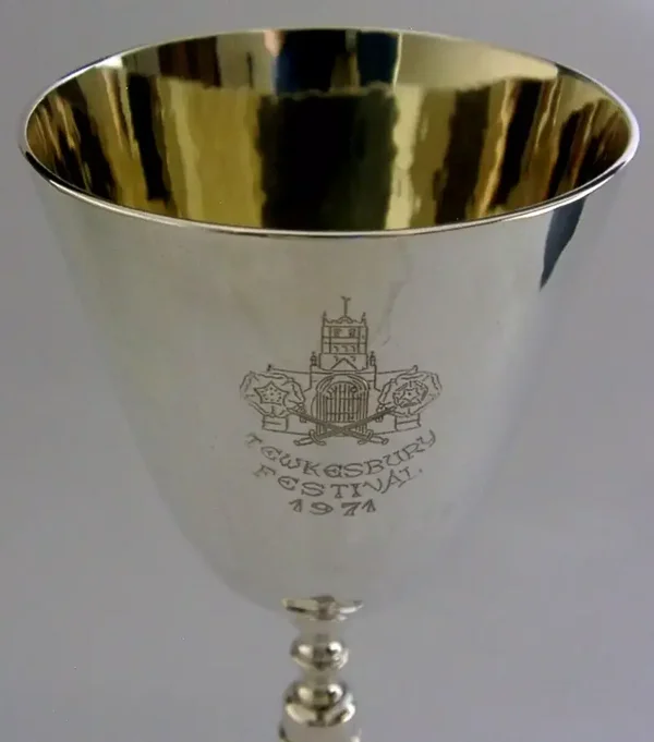 A beautiful hand made English solid sterling silver wine goblet. It is hallmarked for London 1971 with the makers marks being PBH for Peter Harwood of Cheltenham. It has been superbly designed being hand plannished. It was made for the Tewkesbury Festival of 1971 made in limited numbers, this being number 174. It holds 80ml. It is in superb condition being free from dings splits distortions and repairs. It measures approx. 6.5 inches (16.4cm) tall by 2.5 inches (6.1cms) across the rim and weighs 141 grams. A very good quality well made interesting piece.