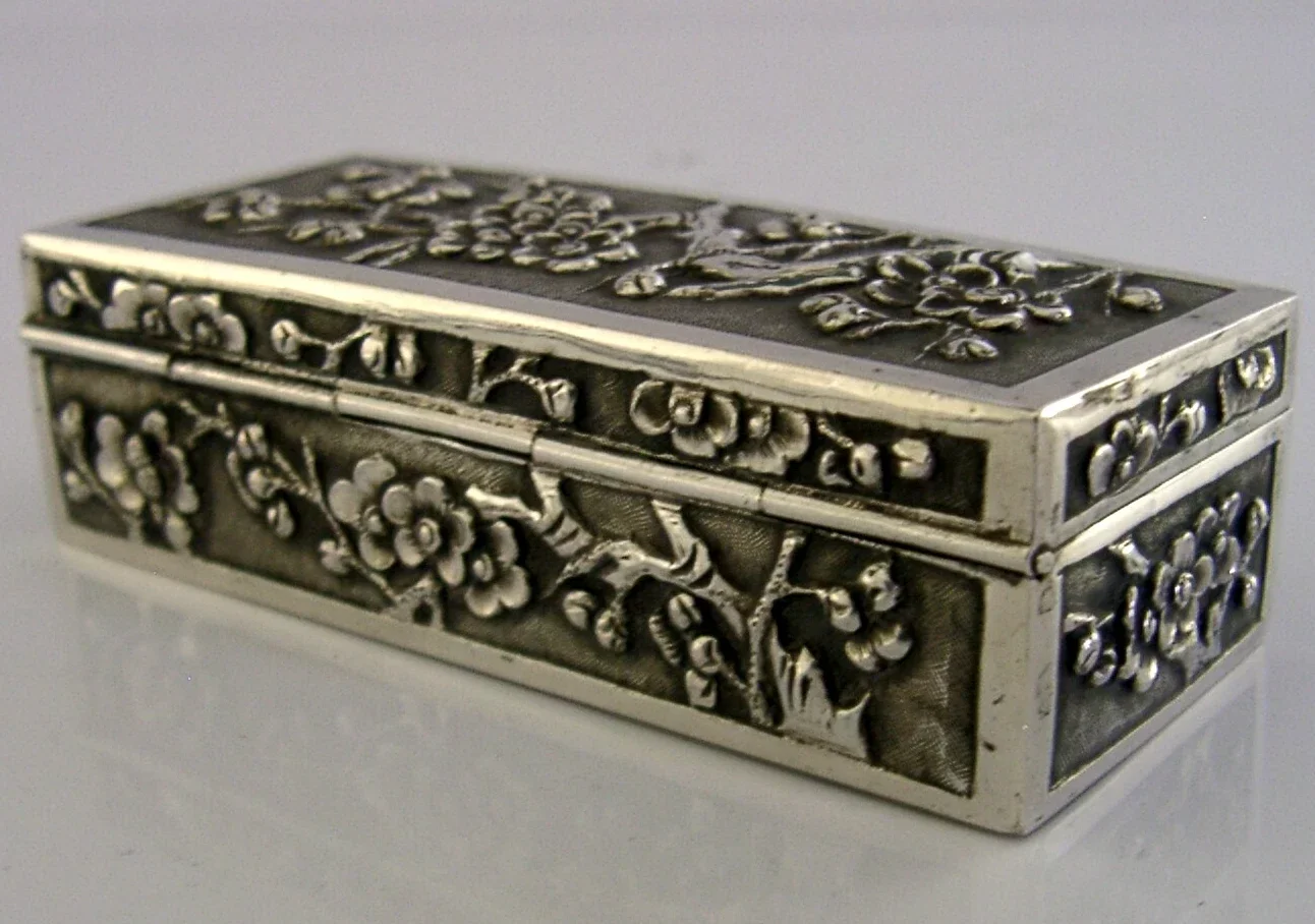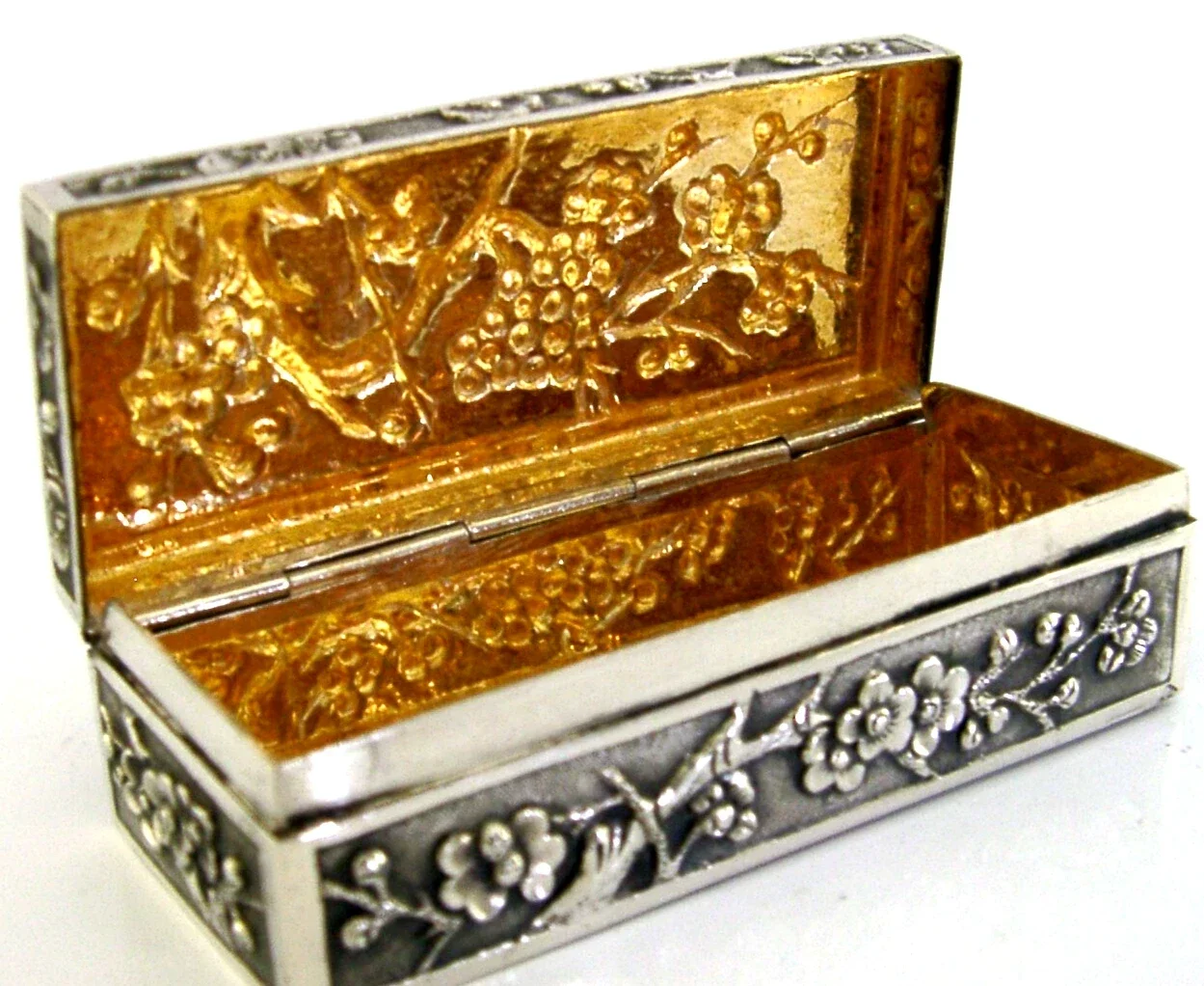A super quality rare Chinese export solid silver box. It is hallmarked with a Chinese character mark and the makers markWH for Wang Hing. I would date it to c1890s. It has been superbly design being embossed with blossom and internally gilded. It is in super condition being free from dings splits holes and repairs. It closes securely. It measures over 3 inches (7.9cms) across by 1.5 inches (3.3cms) wide by 1 inch (2.2cms) tall and weighs 58 grams. A beautifully made high quality rare piece.