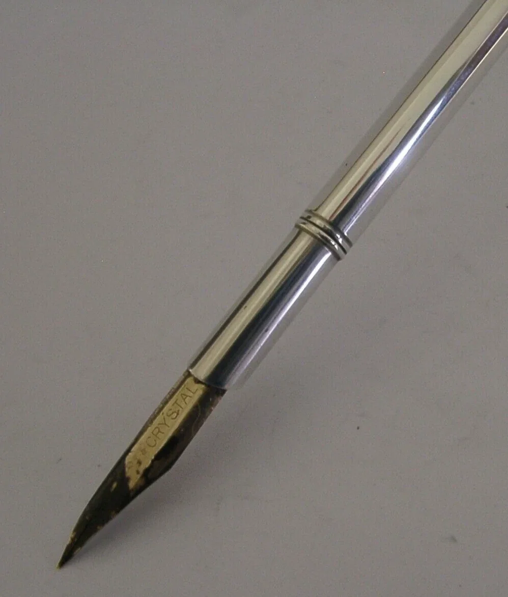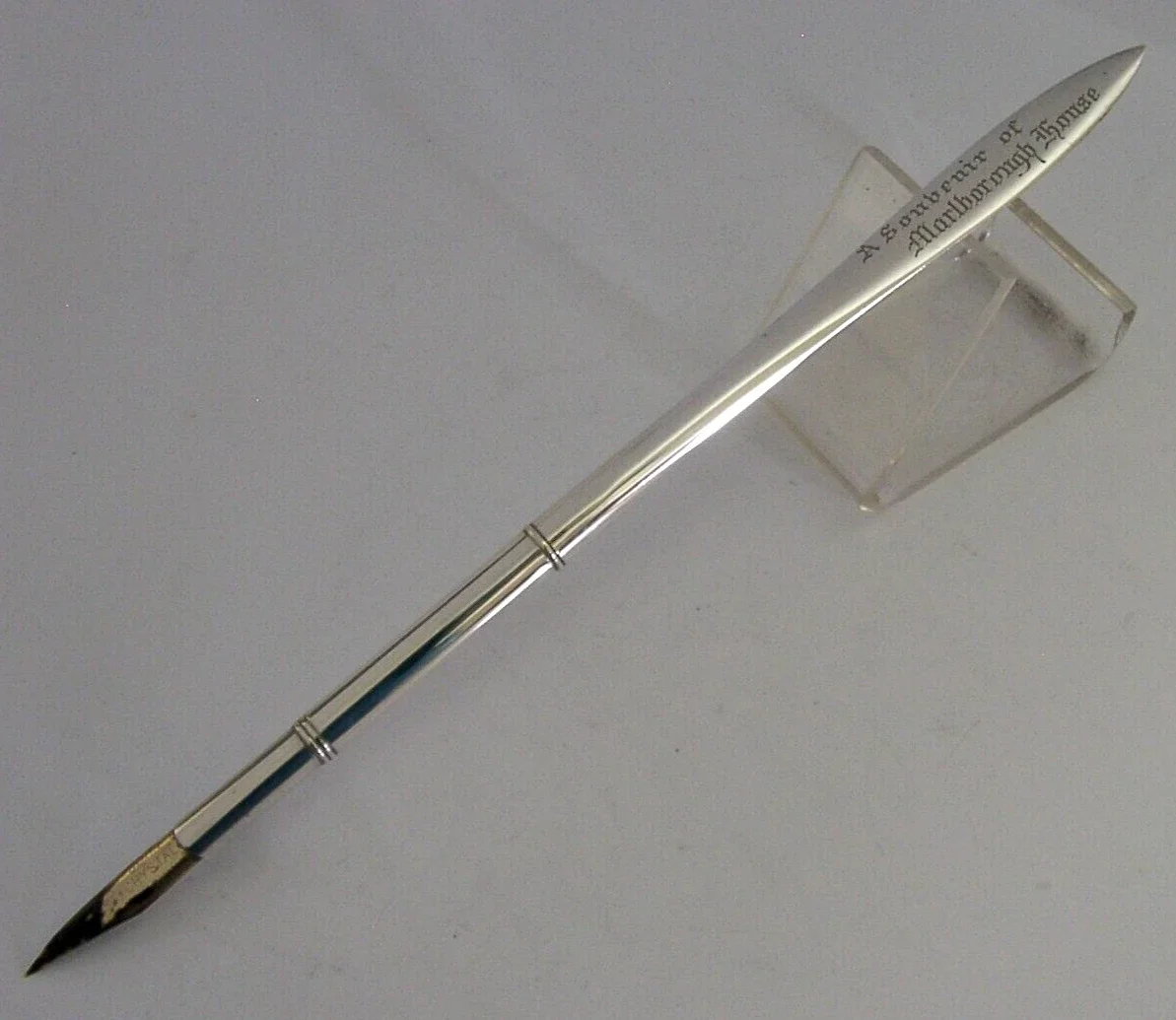 A beautiful English sterling silver combination dip pen / opener. It is hallmarked for Birmingham 1928 with the maker being E Baker & Son. It has been superbly made and engraved 'A Souvenir of Marlborough House'. It is in super condition being free from dings splits holes and repairs. It measures approx. 7.75 inches (19.6cm) long including the nib and weighs 10 grams. A rare piece.