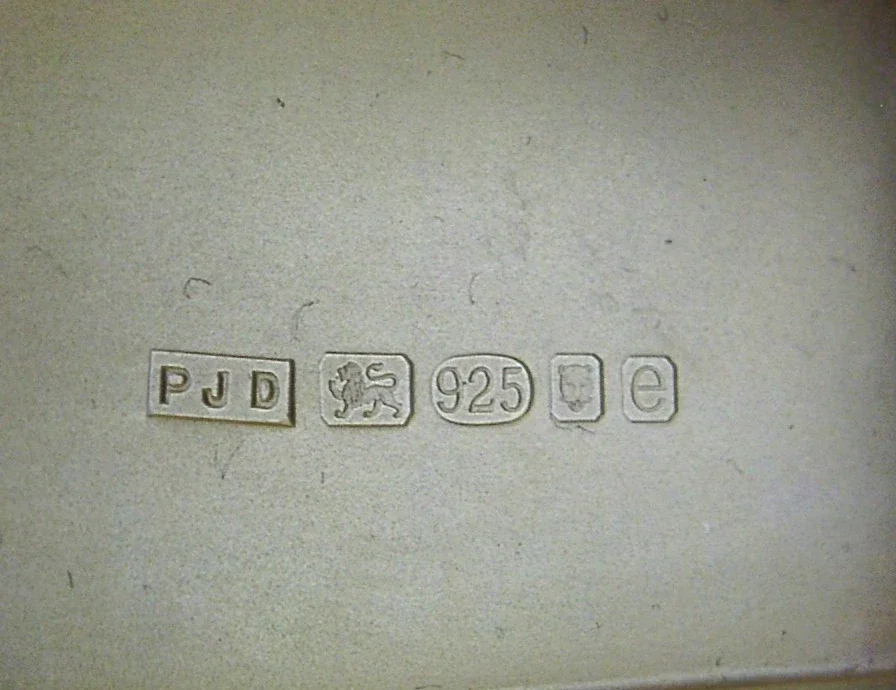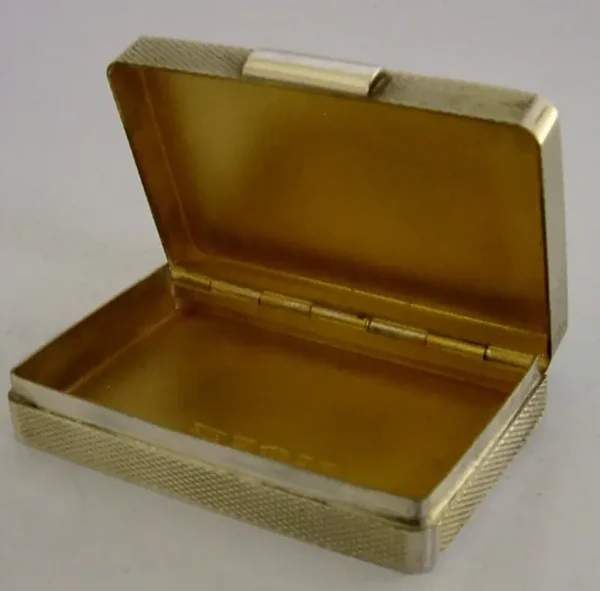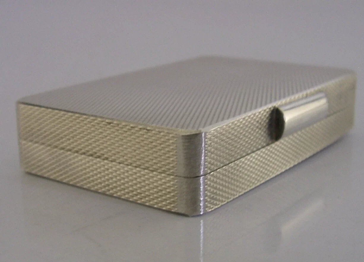 A super quality cased solid sterling silver box. It is hallmarked for London 2004 with the maker being PJD for Peter John Doherty, made for Gallagher's who had links to Aspreys and Garrards. It has a stylish engine turned design and is in super condition being free from dings splits distortions and repairs. The hinge is smooth and tight. The JJG (J J Gallagher) logo is on the base. It measures over 2.5 inches (6.7cm) across by 1.75 inches (4.3cm) wide by over 0.5 inch (1.4cm) tall and weighs 85 grams excluding the outer case. A very high quality example.