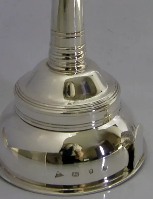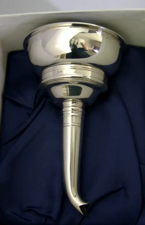 A beautiful mint boxed English solid sterling silver wine funnel. It is hallmarked for London 1996 with the maker being J A Campbell. It has been superbly designed and is in superb condition being free from splits distortions and repairs. The funnel measures approx. 4.75 inches (12.2cm) tall by over 3 inches (7.8cm) across the rim and weighs 105 grams. A top quality well made piece.