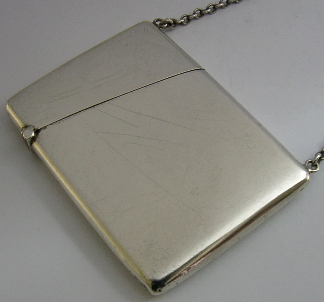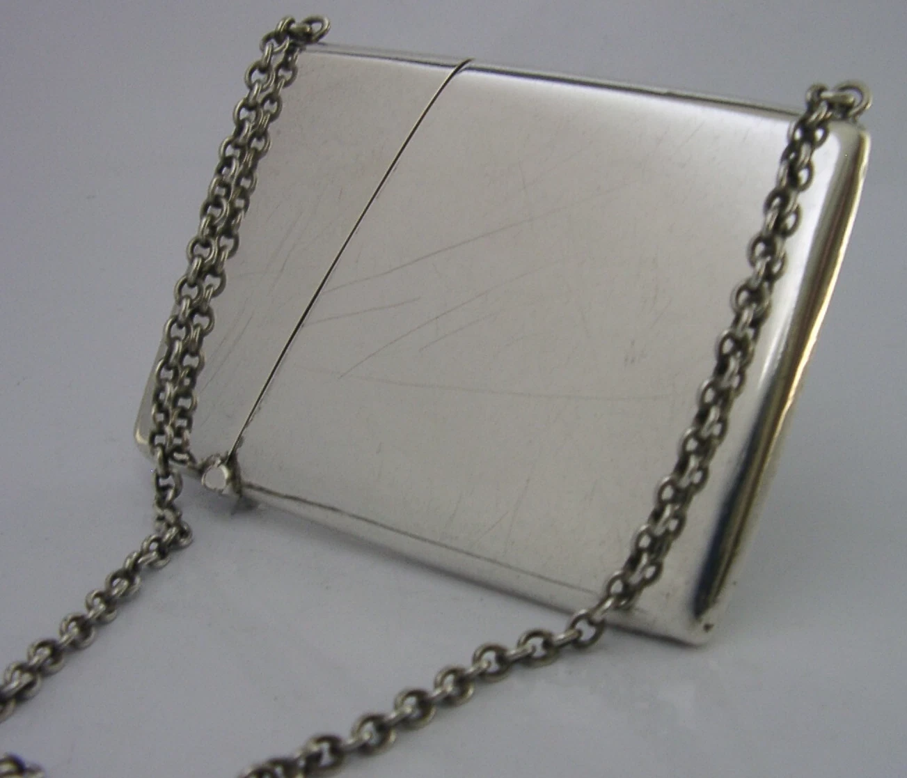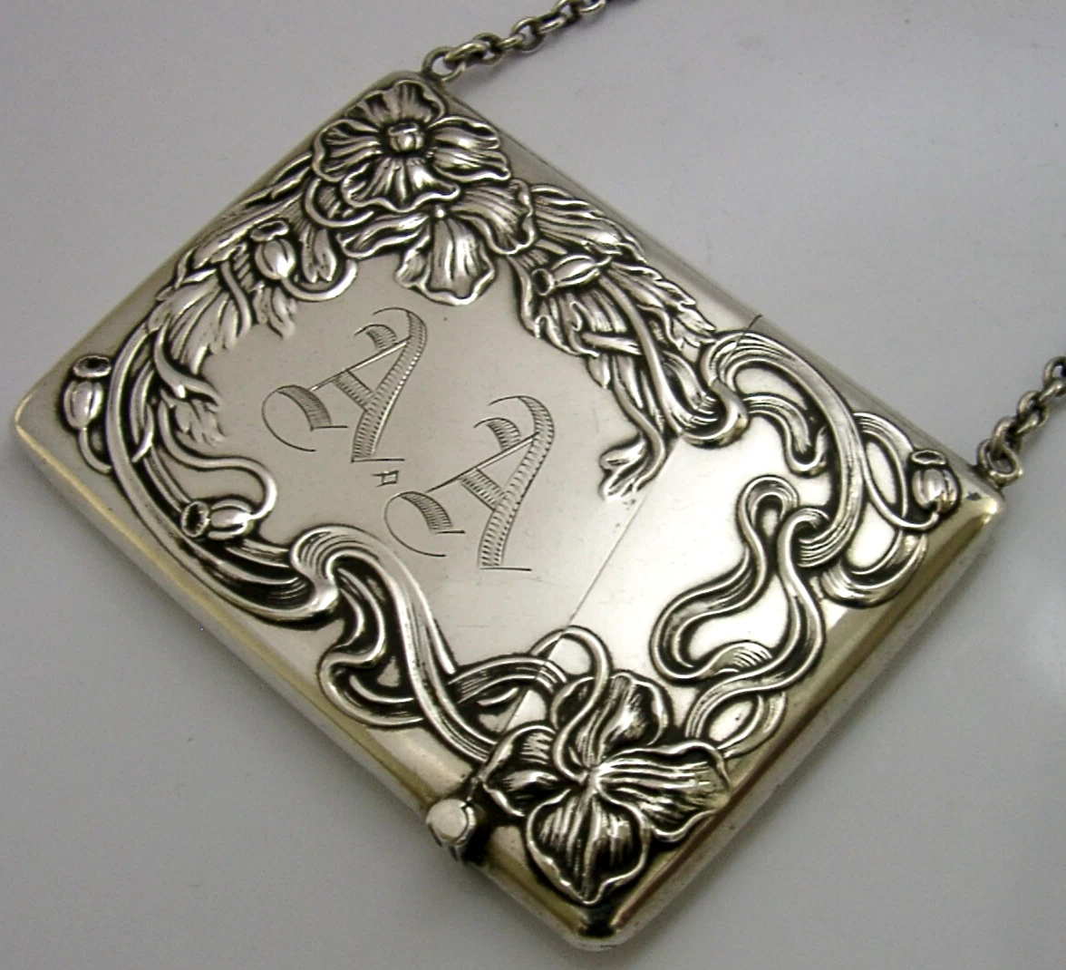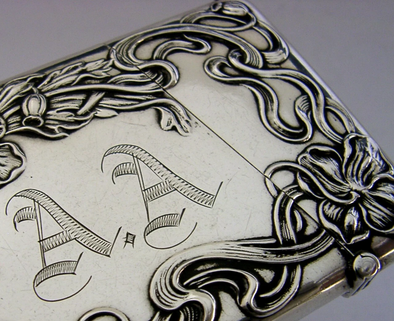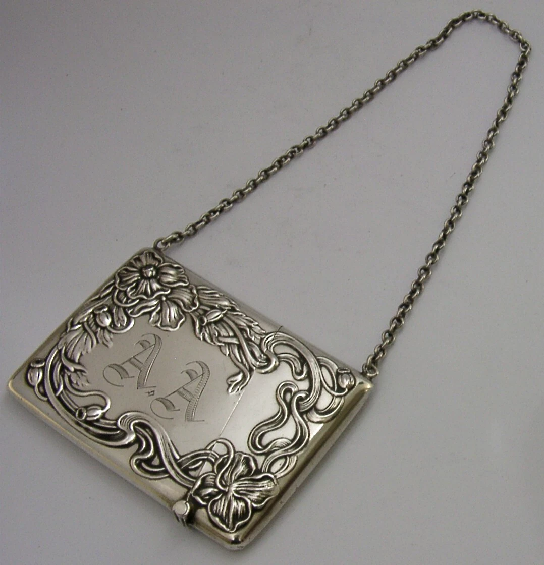 A stunning American sterling silver card case. It is hallmarked sterling but there is no makers mark, however its style and engraving is almost certainly American. It will date to c1905 having a beautiful Art Nouveau design. It has been engraved AA. It is in very good condition being free from dings, splits, holes and repairs, with just a little scratching to the reverse - see photos. It measures approx 3.5 inches (9cm) by 2.75 inches (6.6cm) excluding the chain and 72 grams. A superbly designed top quality example.