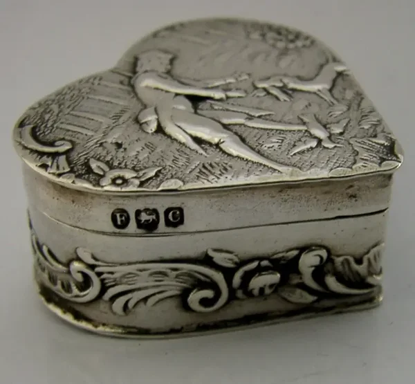 A beautiful Victorian solid sterling silver box. It is hallmarked with import marks for London 1898 with the makers marks being JS, it was almost certainly made in Hanau Germany. It has been superbly made being of love heart form and decorated with a shooting scene to its lid and two figures inside. It is in super condition being free from dings splits holes and repairs, the inside is gilded. It measures approx. 1.75 inches (3.8cm) across by almost the the same front to back by 0.5 inch (1.5cm) tall and weighs 21 grams. A very pretty piece.