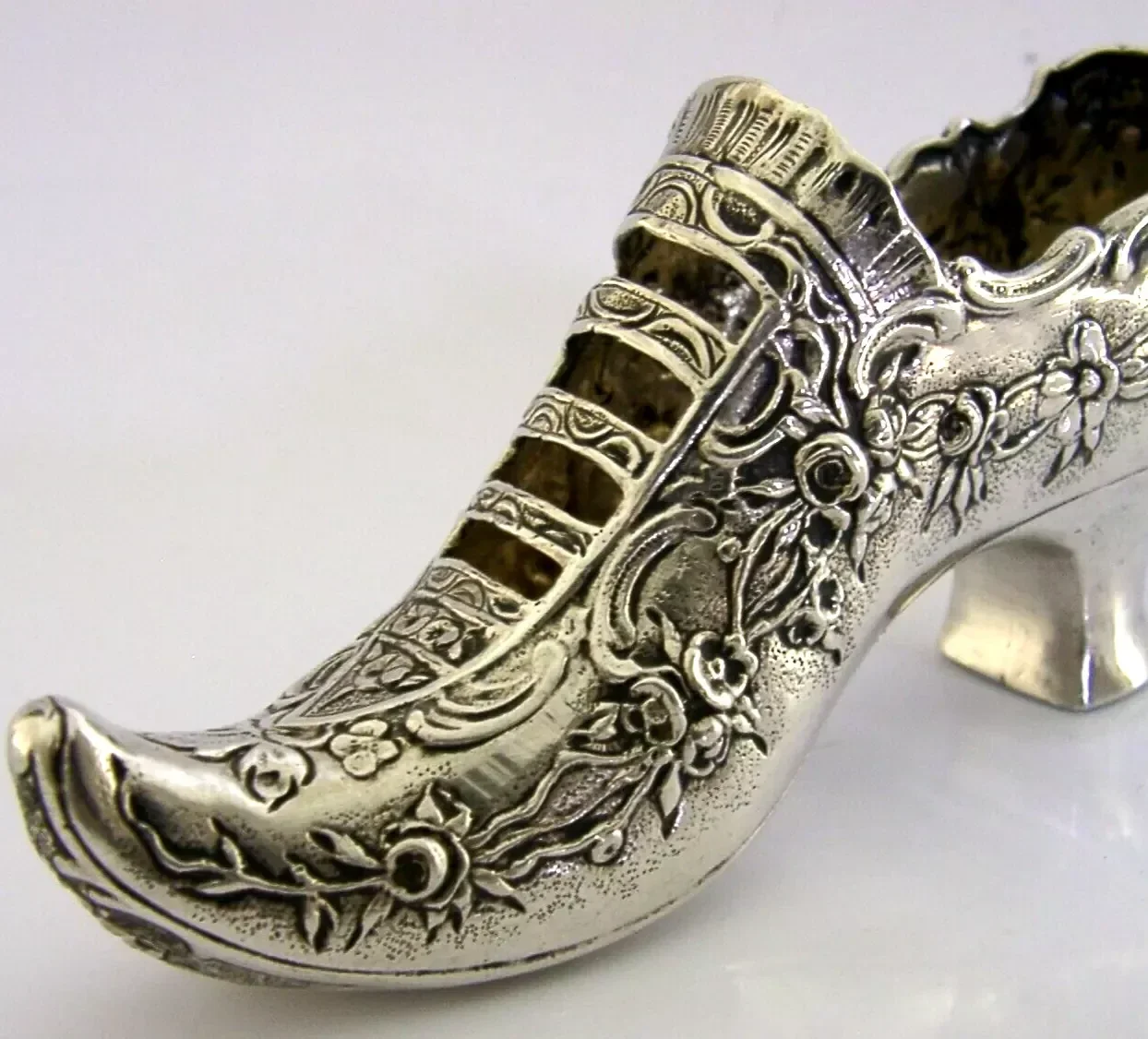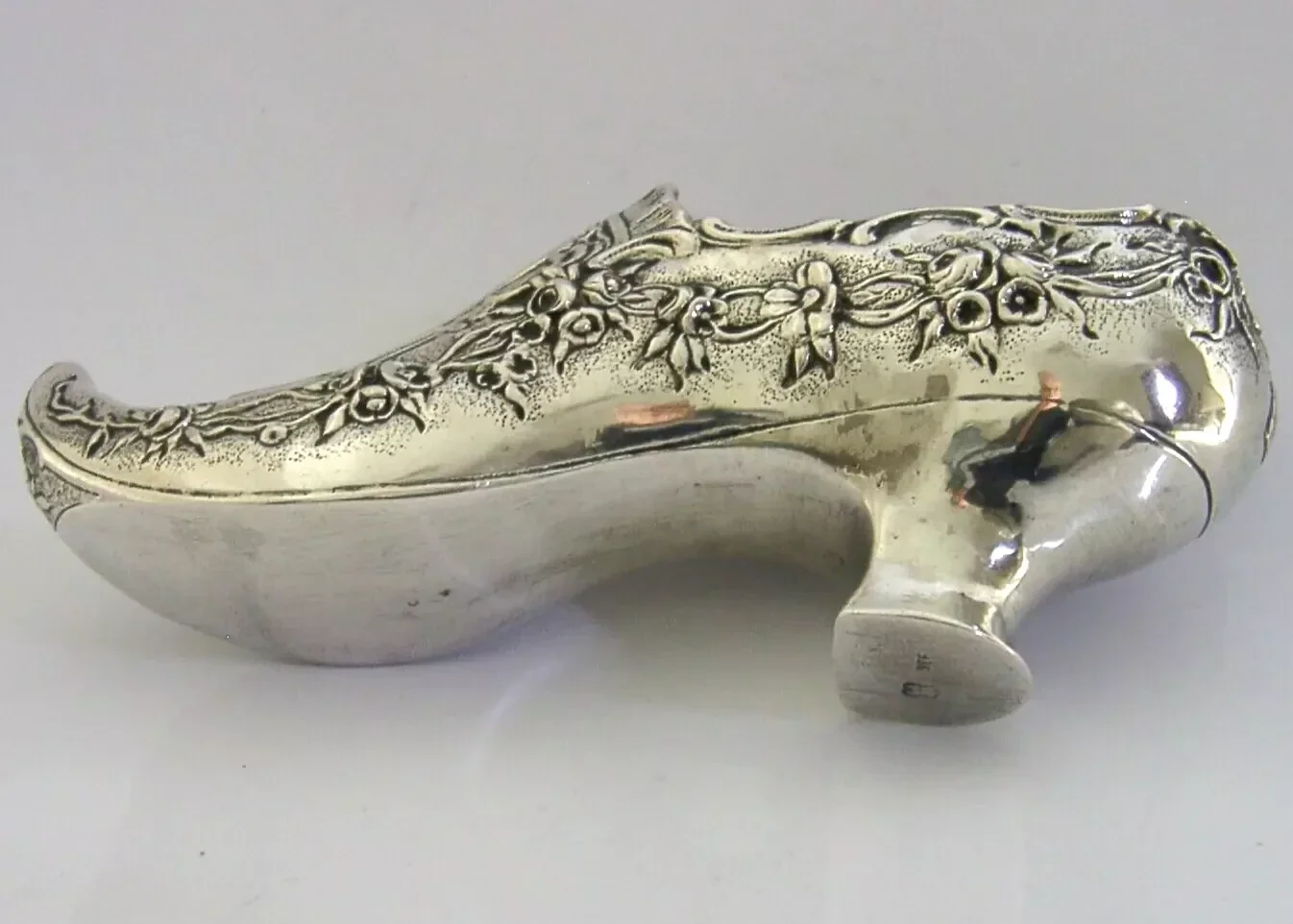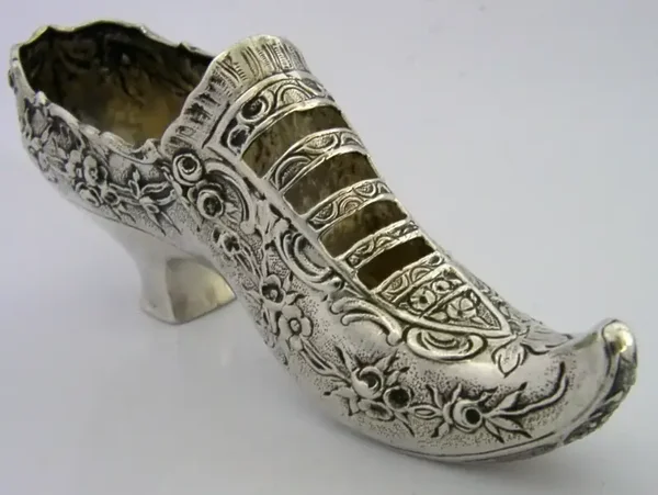 A rare super quality good sized German Hanau solid silver shoe. It is hallmarked with German Hanau marks and I would date it to c1890. It has been superbly designed being in the form of a shoe decorated with scrolls and flowers. It is in super condition being free from dings splits holes distortions and repairs. It measures approx. 4.75 inches (12.2cm) long by 1.25 inches (3.2cm) wide by 2 inches (5.6cm) tall and weighs 58 grams. A high quality rare and unusual example.