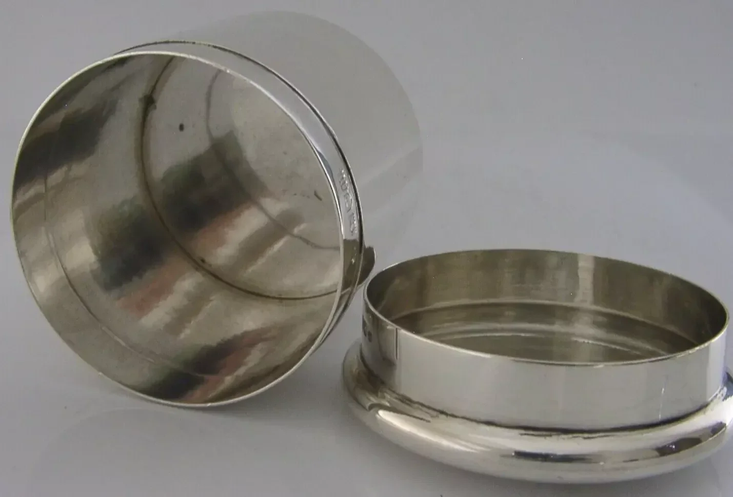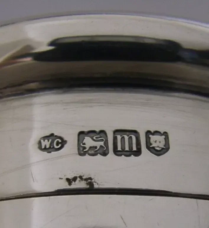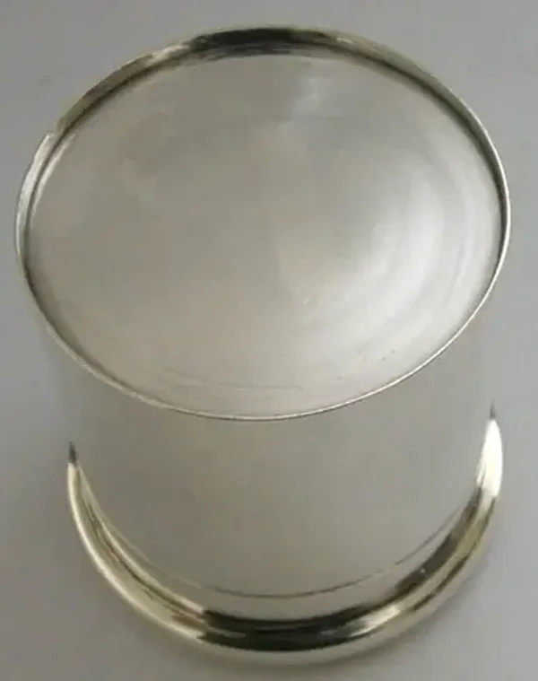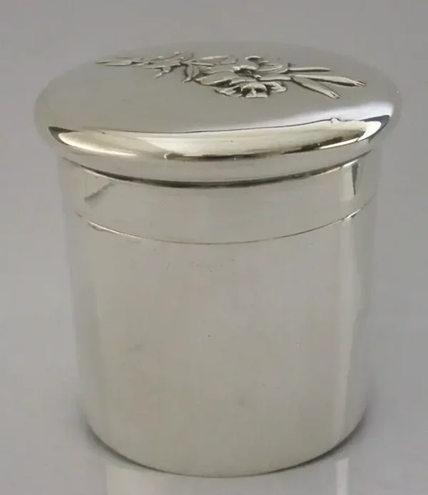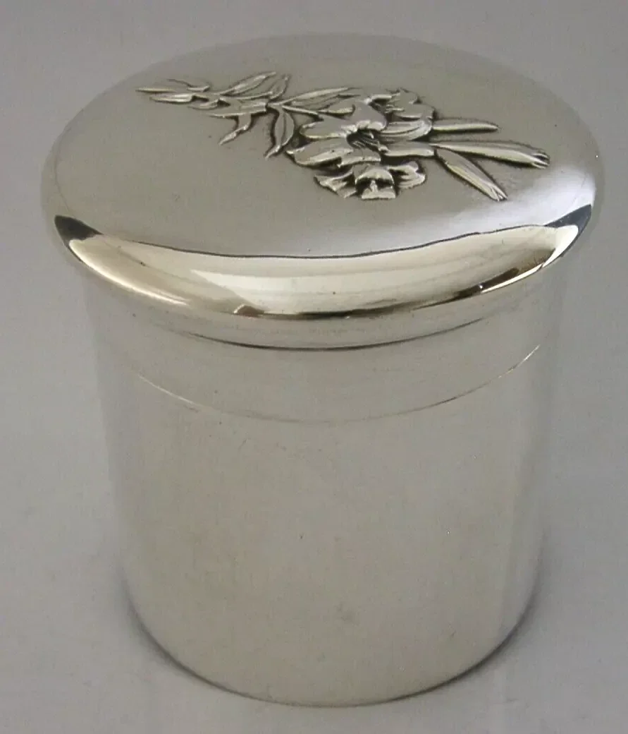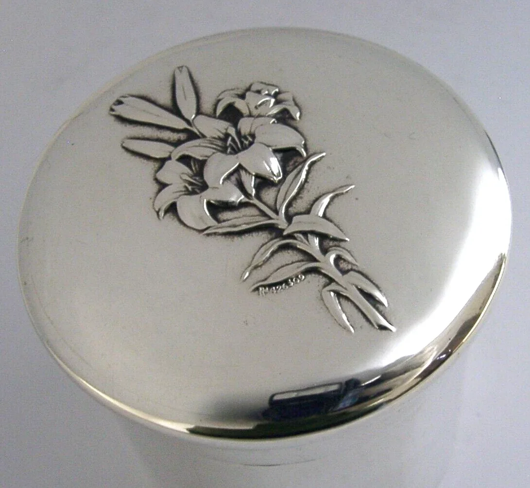 A beautifully English antique solid sterling silver dressing table box or tea caddy. It is hallmarked for London 1907 with the makers marks being that of William Comyns & Sons. It has been beautifully designed with the lid being embossed with lilies. It is in super condition being free from dings splits holes and repairs, the inside is clean and the top fits tightly. It measures approx. 3 inches (7.2cm) across the lid by 2.5 inches (6.5cm) across the base by 3 inches (7.6cm) tall and weighs 118 grams. A beautiful piece.
