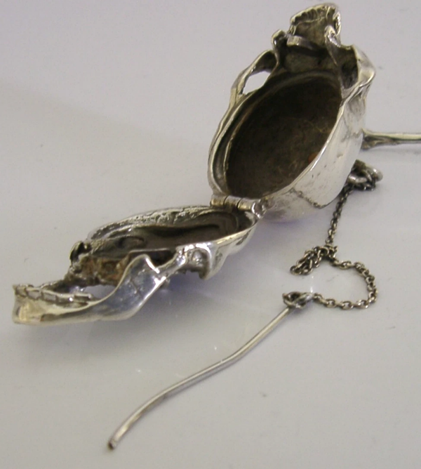 A beautiful high quality solid sterling silver skull box and watch chain. It is unmarked but tests as sterling silver. I would date it to c1980-2000. It has been superbly hand made with the skull being able to open, being held closed by a pin to its base. The chain in the style of a Victorian watch chain is decorated with skulls bones and a hand. It is in super condition being free from dings splits and repairs. It measures approx. 13 inches (33cm) long and weighs 54 grams. A superb piece.