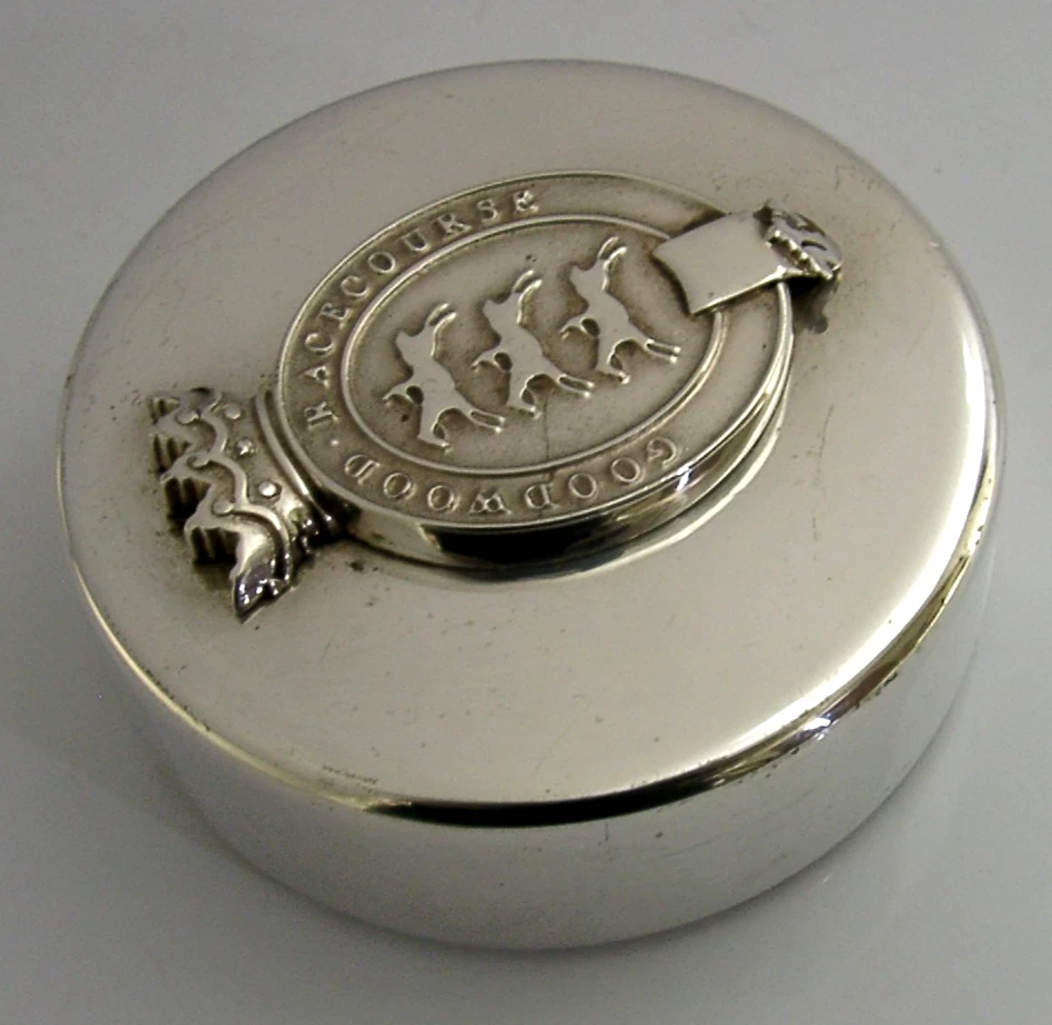 A superb English designer sterling silver paper weight. It is hallmarked for London 1998 with the makers marks being Theo Fennell - jeweller and silversmith to the stars. It has been superb made incorporating the emblem of Goodwood Racecourse to its top. It is in superb condition being free from dings splits and repairs. It measures over 2.75 inches (7.2cm) wide by 1 inch tall and weighs 197 grams (note the centre will be plaster filed). A very well designed piece.