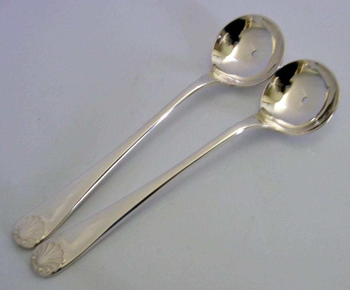 A superb pair of mint solid silver salt spoons. They are hallmarked for Birmingham 2007 with the makers marks being CR&S. They have been beautifully designed incorporating scallop shells and interestingly have small central holes for sprinkling. They are in super condition being free from dings splits distortions and repairs. They measure approx. 4.5 inches (11cm) long by 1 inch wide and have a combined weight of 33 grams. A very nice quality clean set.