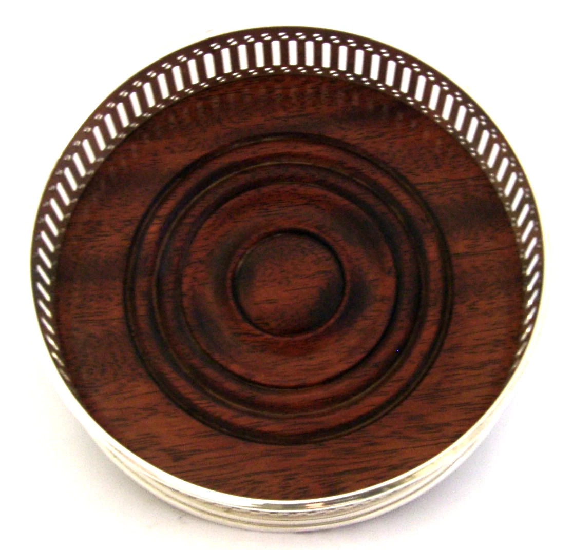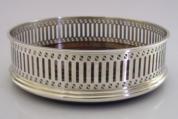 A super quality English solid sterling silver wine or campaign bottle coaster. It is hallmarked for London 1992 with the maker being David R Mill. It has been superbly made with the sides being pierced. It is in super condition being free from dings splits and repairs. It measures approx. 5 inches (13cm) across by over 1.5 inches (4cm) tall and weighs 124 grams. A very nice quality piece.