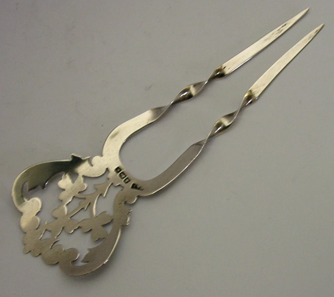 A beautiful English antique solid sterling silver hair slide or comb. It is hallmarked for Birmingham 1906 with the makers mark being P&T. It has been beautifully made being pierced with shamrocks and has two spiral prongs. It is in superb condition being free from dings splits and repairs. It measure approx. 4.25 inches (11cm) long by 1.5 inches (3.7cm) wide and it weighs 5 grams. A beautiful very high quality example.