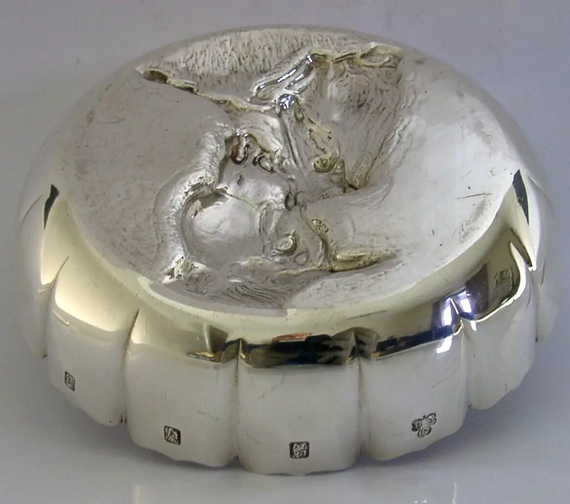 A stunning top quality Irish solid sterling silver bowl or dish. It is hallmarked for Dublin 1979 with the makers mark being JCB. It has been superbly made depicting a new born foal being nuzzled by its mother. It is in super condition being free from dings splits holes and repairs. It measures approx. 6 inches (5.2cm) across by 1.25 inches (3.4cm) tall and weighs 192 grams. A top quality piece.