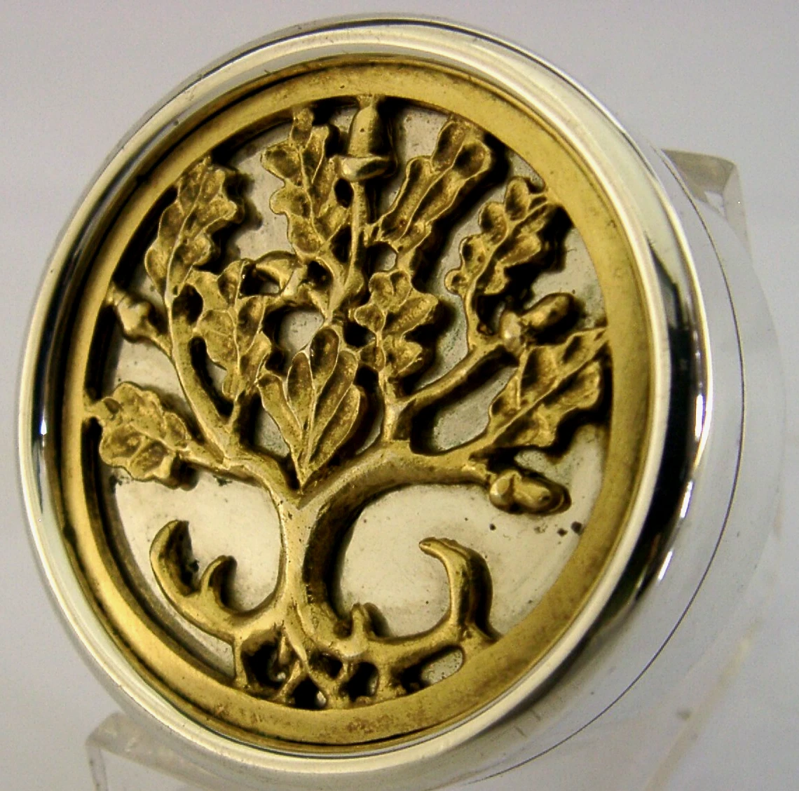 A beautiful English solid sterling silver trinket box. It is hallmarked for London 2000 with a makers mark being NP for Nicholas Plummer, a highly regarded designer silversmiths. It has been superbly designed with the lid being decorated with a gilded oak tree design. It is in superb condition being free from dings splits and repairs. It measures almost 2 inches (4.8cm) across by 0.75 inch (1.9cm) tall and weighs 64 grams. A very pretty piece.