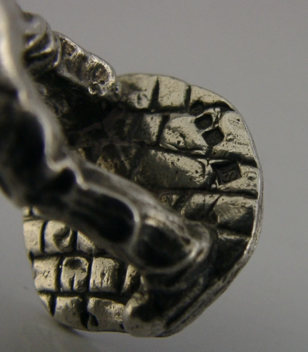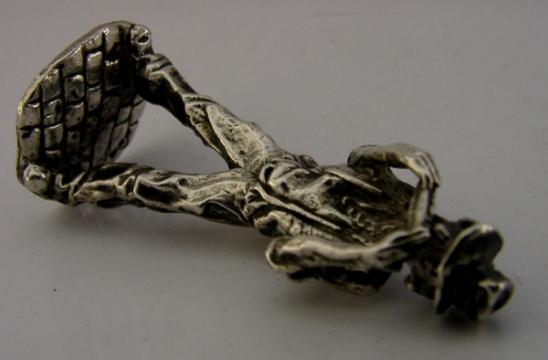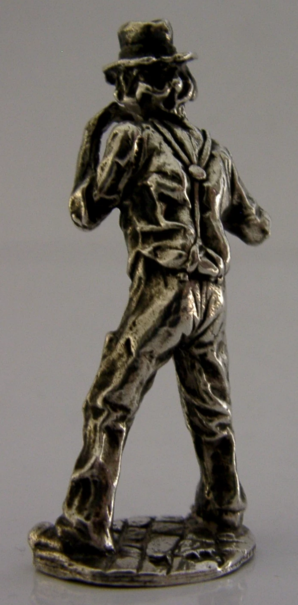 A quality English solid cast sterling silver figure. It is hallmarked for London 1976 with the maker being SMC. It has been superbly cast in the form of a mouth organ player. It is in super condition being free from dings splits and repairs. It measures approx. 2 inches (5cm) tall by 1 inch (2.6cm) across the end and weighs 33 grams. A quality piece.