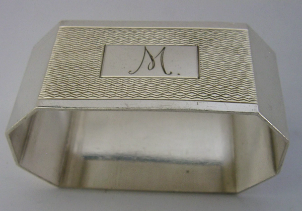 A very stylish English solid sterling silver napkin ring. It is hallmarked for Birmingham 1970 with the maker being JH&S. It has been superbly made being engine turned and engraved M. It is is in superb condition being free from dings splits distortions and repairs. It measures 2.25 inches (5.6cm) across by 1.25 inches (2.8cm) by the same tall and weighs 28 grams. A very nicely designed stylish piece.