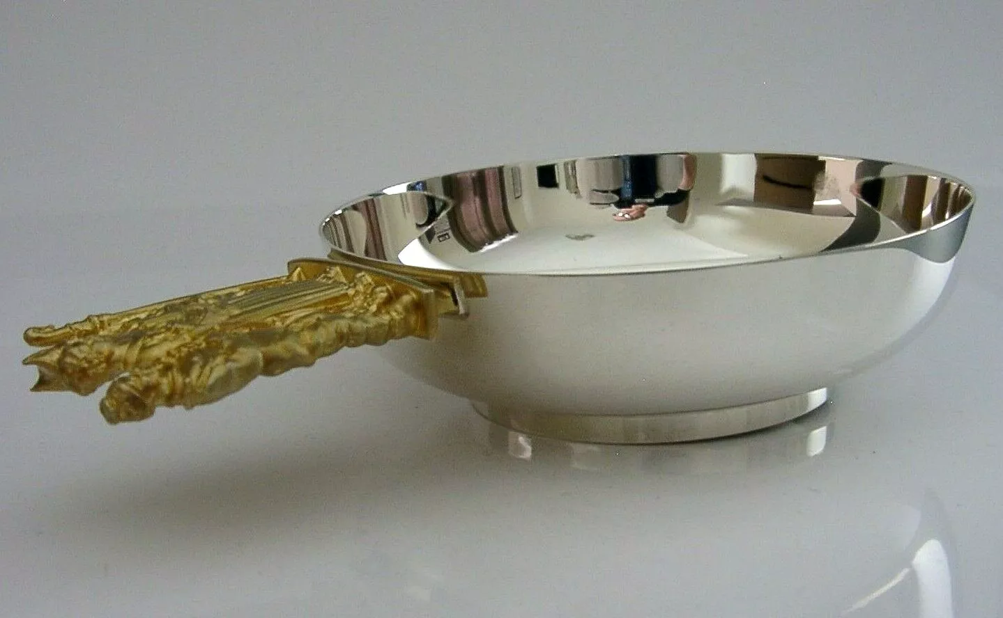 A rare boxed English solid sterling silver limited edition bowl or porringer. It is hallmarked for London 1979 with the makers marks being HM for Hector Miller. It has been made as a limited edition being number 109 of 900 made by order of the Dean and Chapter to commemorate the ninth centenary of Winchester Cathedral. It is in super condition being free from dings splits and repairs. It is nice and clean inside. It measures 6.75 inches (17cms) across including the handle and 4.5 inches (11.7cms) excluding it by over 1.25 inches (3.5cms) tall to the rim and weighs 220 grams. A rare piece.