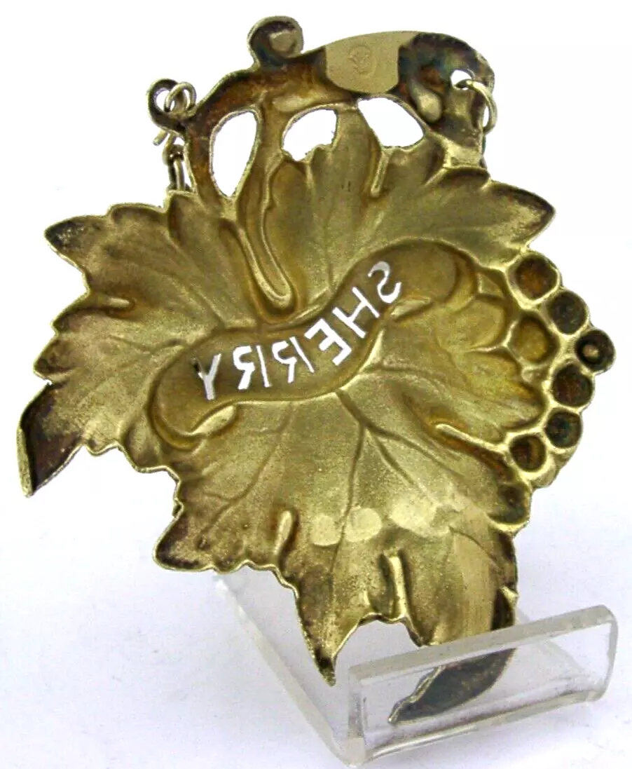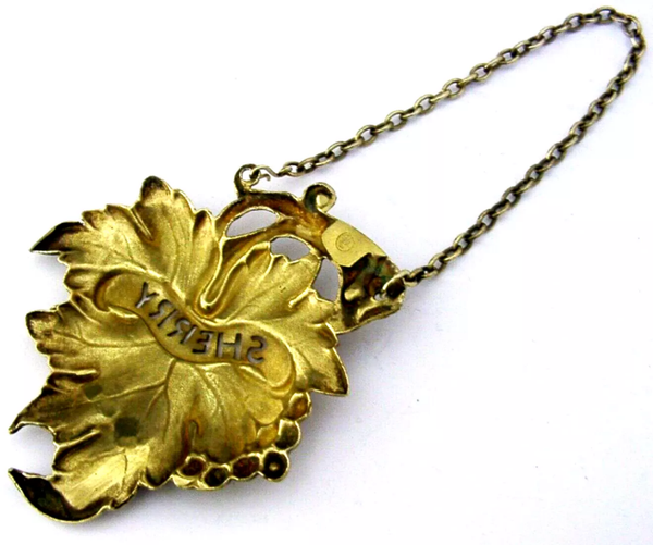 A top quality very large heavy cast English solid sterling silver gilt sherry decanter label. It is hallmarked for London 1989 and the makers mark being difficult to read. It has been very well designed in the form of a gilded (gold on silver) vine leaf and is in superb condition being free from dings splits and repairs. It measures approx. 2.75 inches (6.8cms) wide by 3 inches (7.7cms) tall excluding the chain and complete with its chain weighs 42 grams. A very well designed top quality piece.