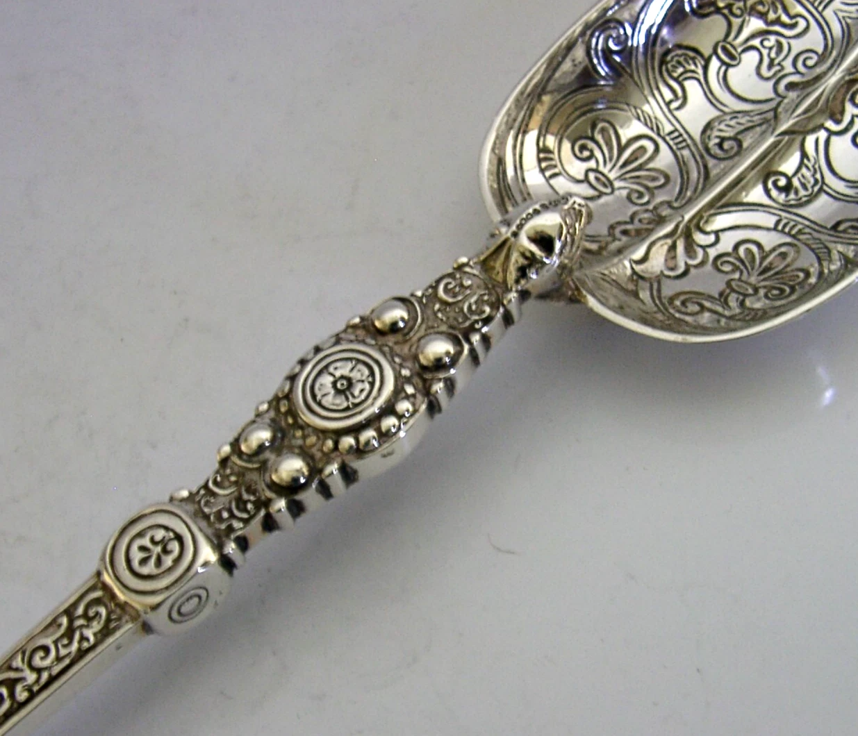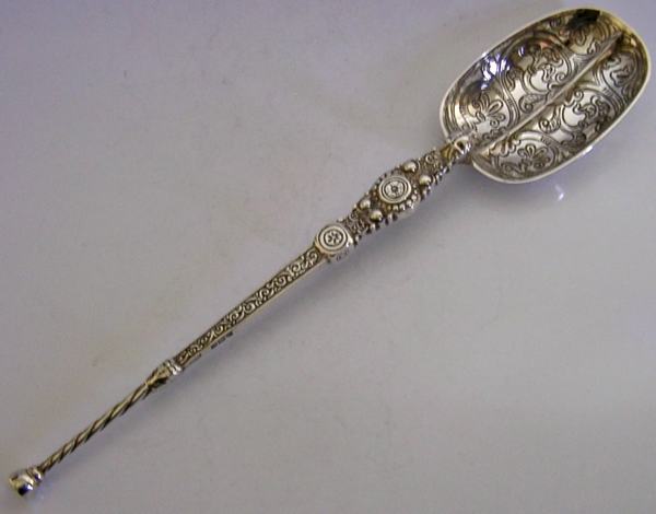 A superb large English antique solid sterling silver spoon. It is hallmarked for London 1901 with the maker being CB. It has been superbly made being a replica of the coronation spoon used to anointed the Kings and Queens of the Great Britain. It is in super condition being free from dings splits holes and repairs. It measures approx. 10.25 inches (26cm) long by over 2 inches (5.3cm) wide and weighs 110 grams. A very nice quality unusual piece.