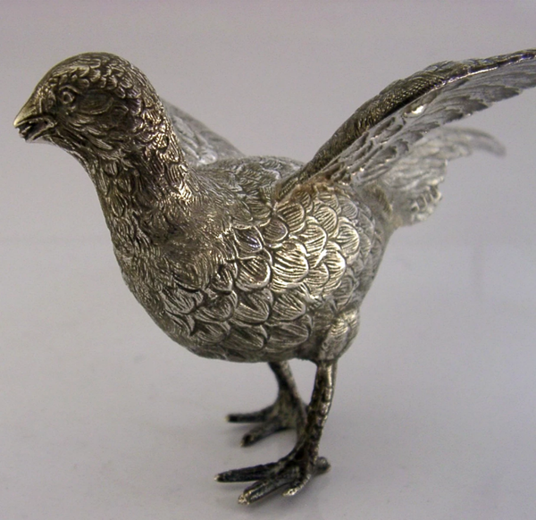A superbly modelled large sterling silver bird figure. It is hallmarked for London 1973 with the maker marks being AC Co. It has been beautifully modelled being finely cast in the form of a pheasant bird. It is in super condition being free from dings splits and repairs. It measures approx. 7 inches (18cm) long beak to tail by 4.25 inches (10.4cm) wide by 3 inches tall and weighs 198 grams (all silver weight, i.e. it is not filled). A very well designed high quality rare example.