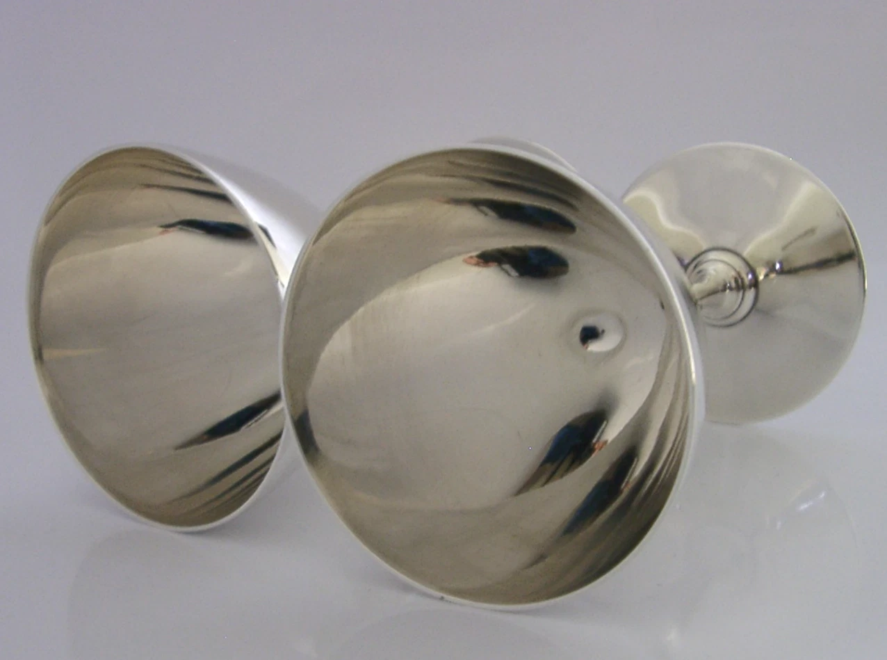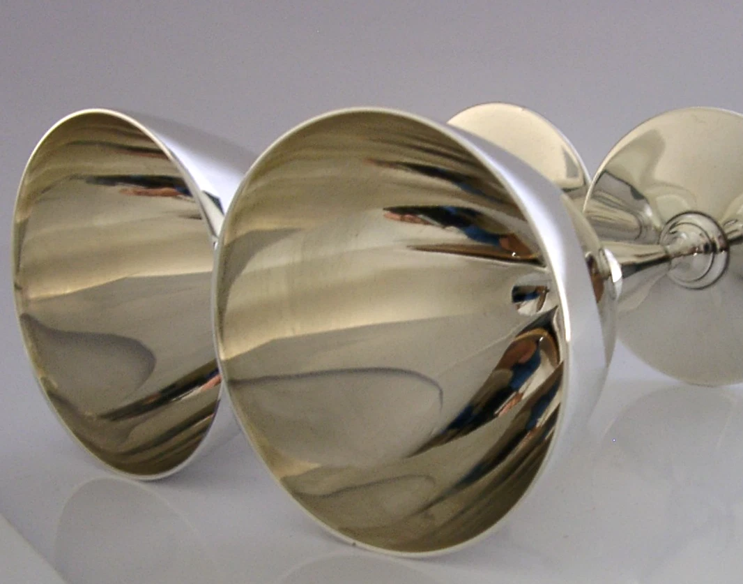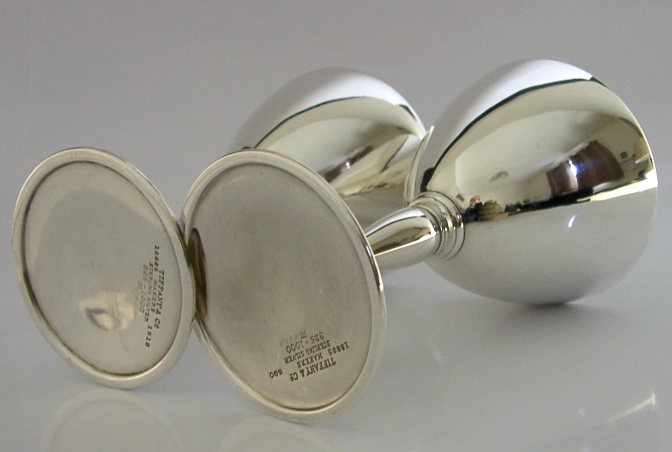 A beautiful very high quality pair of American solid sterling silver cocktail glasses. They are hallmarked STERLING along with the makers marks of Tiffany and Co, used 1907-1947. I would date these to c1920s. They have a very stylish design and are in super condition being free from from dings splits distortions and repairs. They measures approx. 4.25 inches (10.5cm) tall by 2.75 inches across the rims and combined they weigh 241 grams. A top quality well made very stylish set epitomising the era.