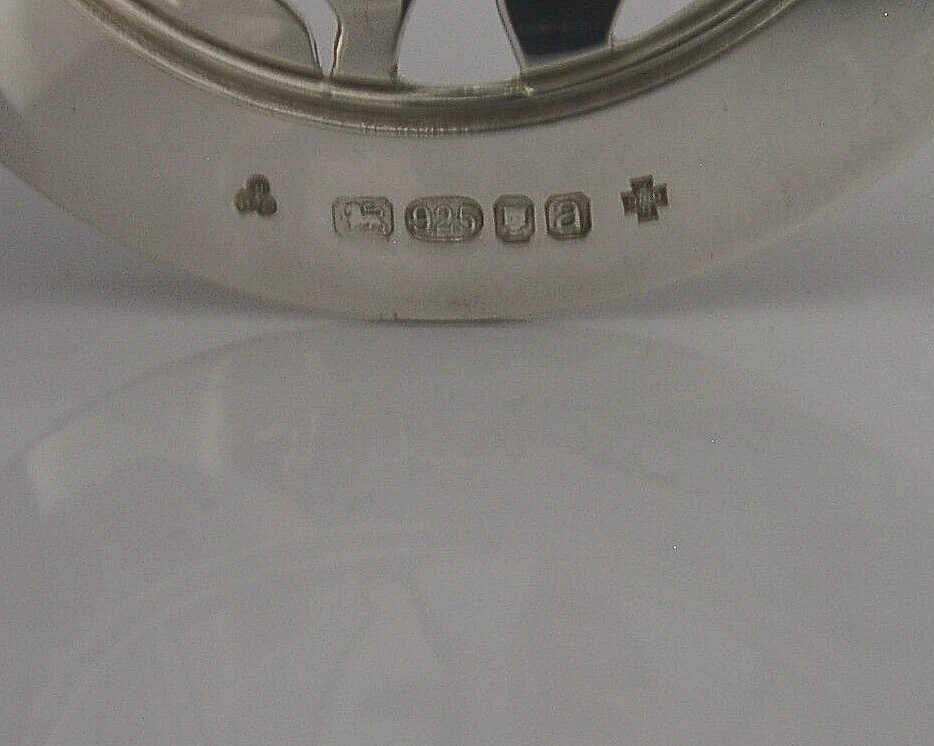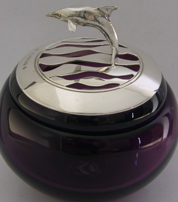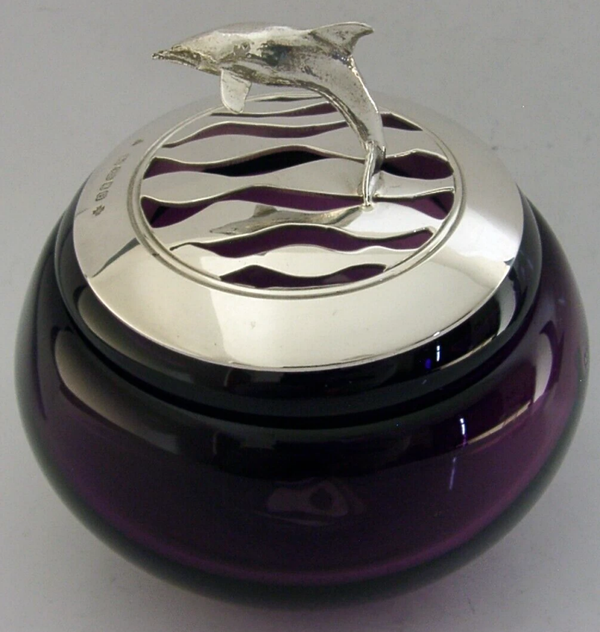 A superb rare English solid sterling silver potpourri bowl. It is hallmarked for London 2000 with the makers marks being that of Maxwell, Aylwin & Co. It has been beautifully made from purple glass with a sterling silver cast dolphin top. It is is superb condition with the silver being is free from splits repairs and dings. The glass is free from cracks chips and repairs. It measures approx. 3.5 inches (9cm) tall by 3.5 inches (9cm) across at its widest point and weighs 342 grams. A superb rare piece.