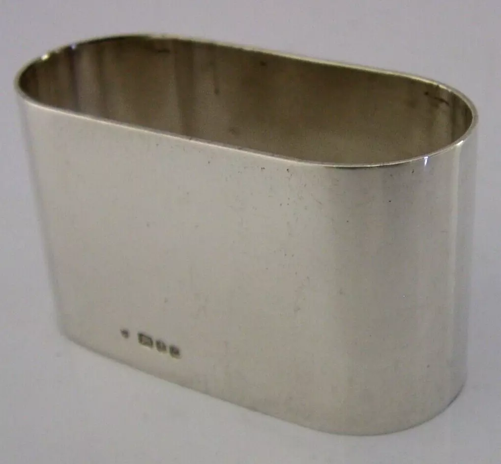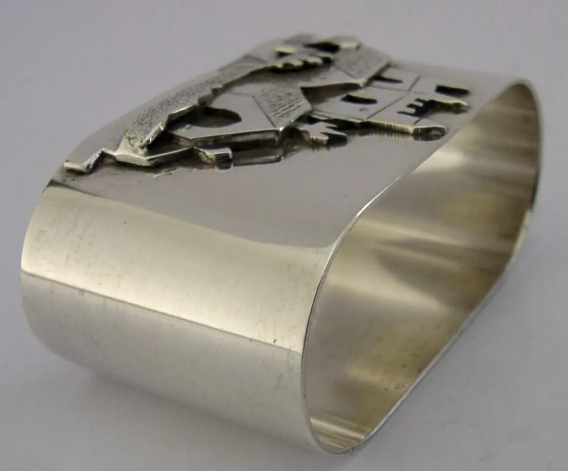 A top quality hand made English solid sterling silver napkin ring. It is hallmarked for London 1979 with the maker mark being JP. It has been beautifully hand made having an applied church to its front. It is in super condition being free from dings splits and repairs. It measures approx. 2.25 inches (5.5cm) wide by 1.25 inches (3cm) by 1 inch and weighs 45 grams. A very nicely made piece.