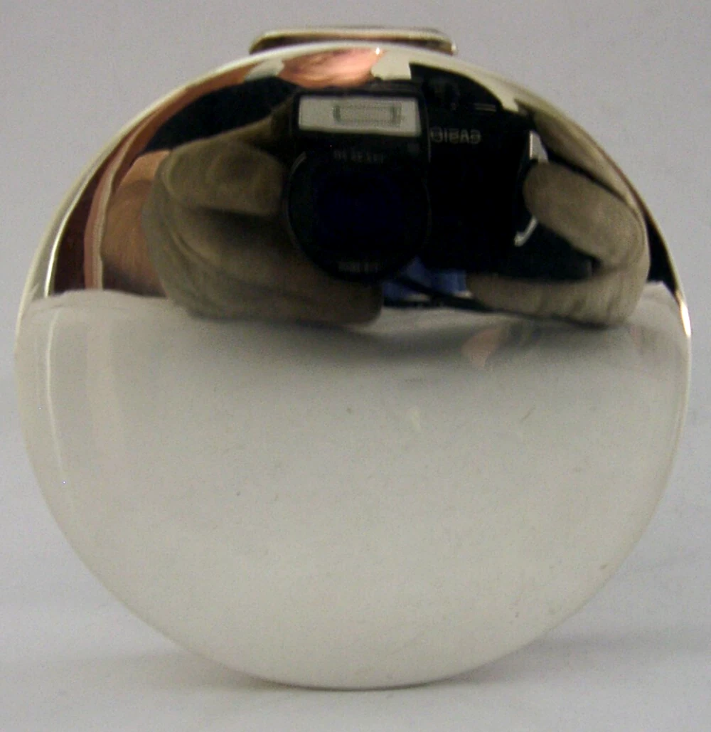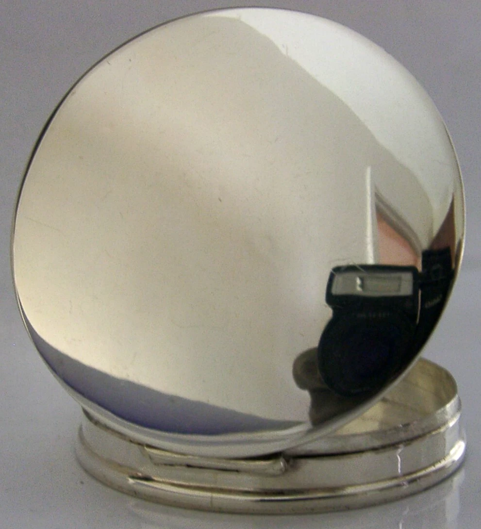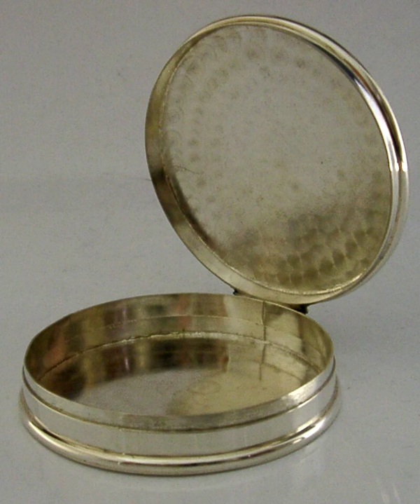 A super quality solid sterling silver box. It is hallmarked with English import marks for London 1998 with the importers mark being HJ. It has a stylish circular design and is in super condition being free from dings splits distortions and repairs. The hinge is smooth and tight. It measures approx. 2.75 inches (6.8cm) across by 0.5 inches (1.5cm) tall and weighs 64 grams. A high quality example.