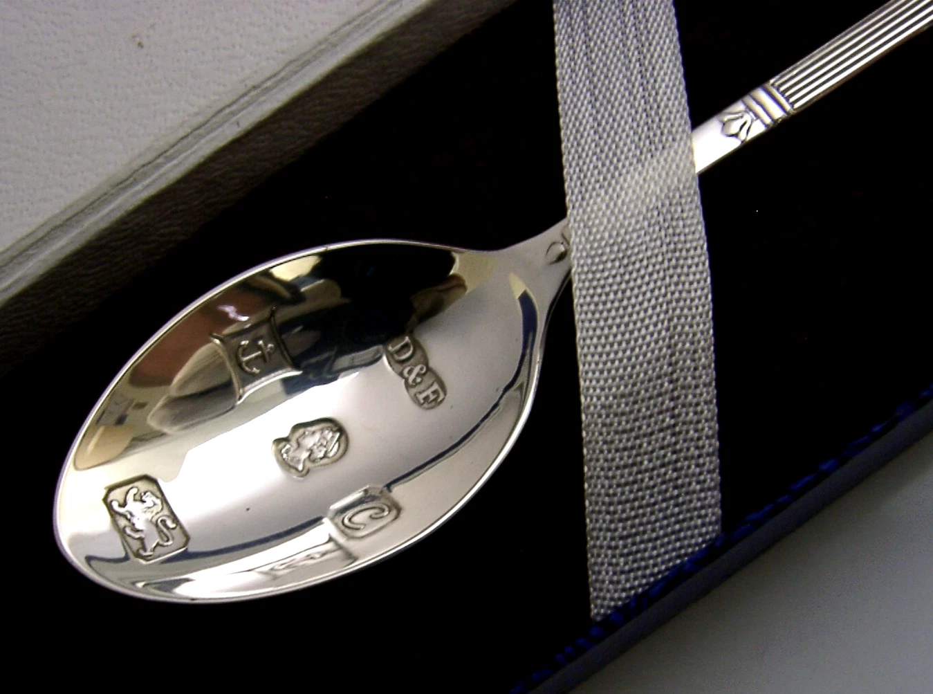 A nice quality boxed English solid sterling silver and enamelled Royal spoon. It is hallmarked for Birmingham 1977 with the maker being Deakin & Francis. It has been superbly made having its terminal being enamelled in the form of the Royal Coat of Arms and the bowl having featured hallmarks. It is in superb condition being free from dings splits and repairs. It measures approx. 4.75 inches (12cm) long by 1 inch (2.6cm) wide and weighs 16 grams. A superb example.