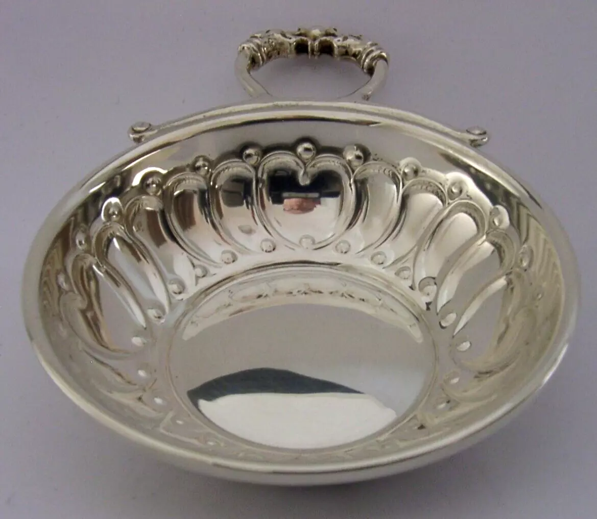 A beautiful English solid sterling silver wine taster. It is hallmarked for Birmingham 1997 with the maker being Harrison Brothers & Howson Ltd. It has been beautifully made with the handle being cast in the form of two beasts and the bowl being embossed with a love heart design. It is in superb condition being free from dings splits and repairs. It is nice and clean inside. It measures a touch under 4 inches (9.8cm) wide including the handle and 3 inches (7.4cm) excluding it by 0.75 inch (1.9cm) tall and weighs 42 grams. A nice clean usable piece.