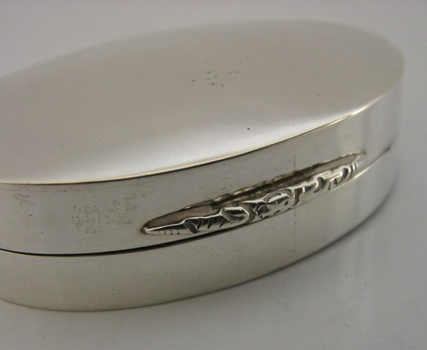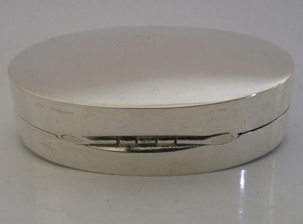 A super quality solid sterling silver snuff or pill box. It is hallmarked for Birmingham 1994 with the maker’s marks being PJD for Peter John Doherty, made for Gallagher's who had links to Aspreys and Garrards. It has a stylish oval design with cast catch and internally gilding. It is in super condition being free from dings splits distortions and repairs. The hinge is smooth and tight. The JJG (J J Gallagher) logo is on the base. It measures over 2 inches (5.2cms) across by 1.25 inches (3.2cms) wide by 1.3cms tall and weighs 38 grams. A very high quality example.